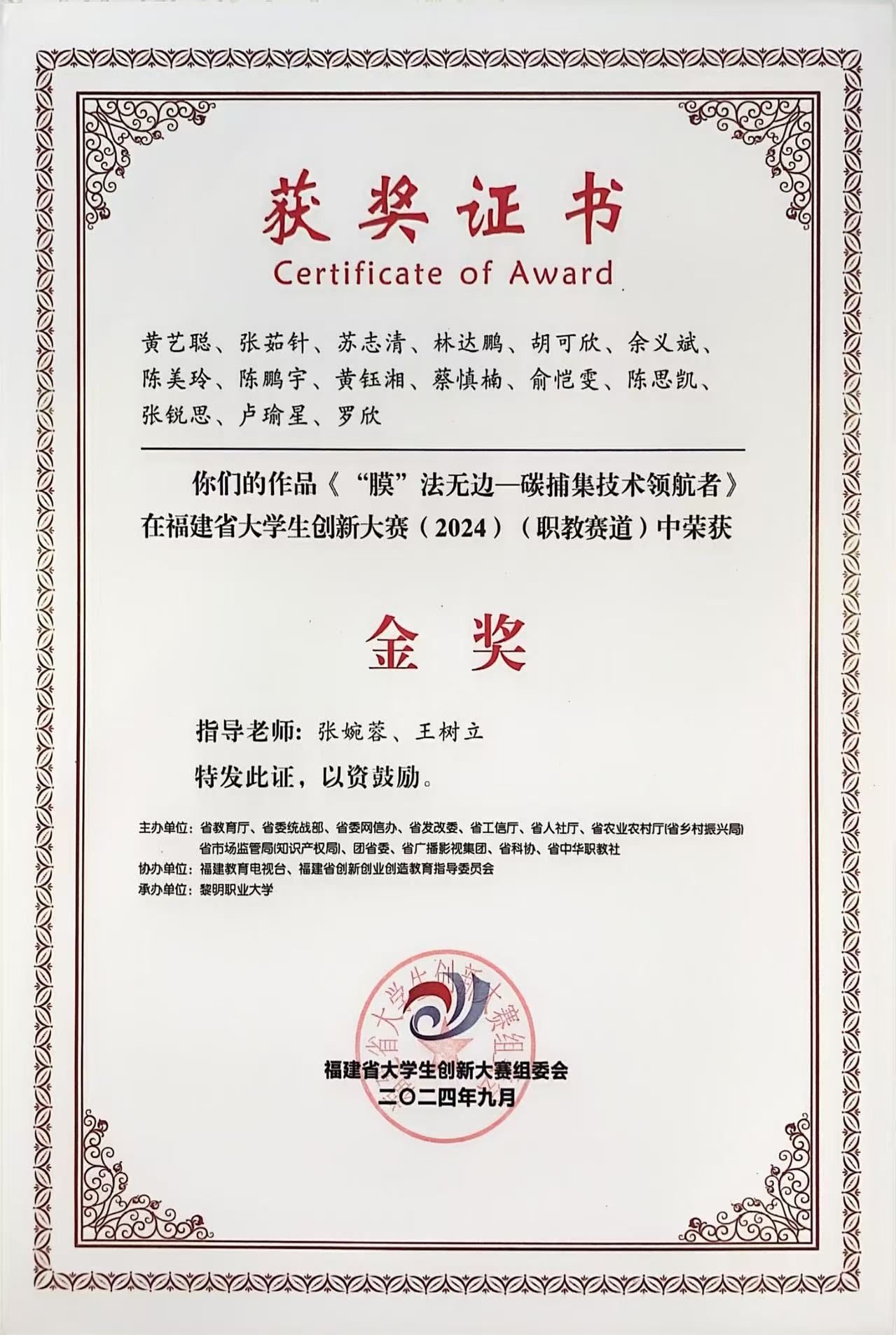 用好科研平台。党支部依托福建省清洁能源应用技术协同创新中心、福建省汽车清洁能源高校应用技术工程中心、泉州市绿色油品生产技术与应用科技创新平台、汽车洁净能源技术研究所4大科研平台,设立“党员先锋岗”“学生科研创新岗”。教师党员积极发挥引领作用,从学生大一阶段开始,便引导他们主动参与科研项目。带领学生开展技术研发、课题研究、技能竞赛以及创新创业活动,培养学生科研兴趣,提升学生的创新意识与能力。如学生团队在党员教师指导下完成的《膜法无边-碳捕集技术领航者》《电织光辉——开创电化学类金属陶瓷层纺织综丝新纪元》项目荣获 “中国国际大学生创新大赛省级金奖”,《碳索未来-膜技术二氧化碳捕集解决方案》获得 “中国国际大学生创新大赛国家级铜奖”,并成功申请实用新型专利2项。
