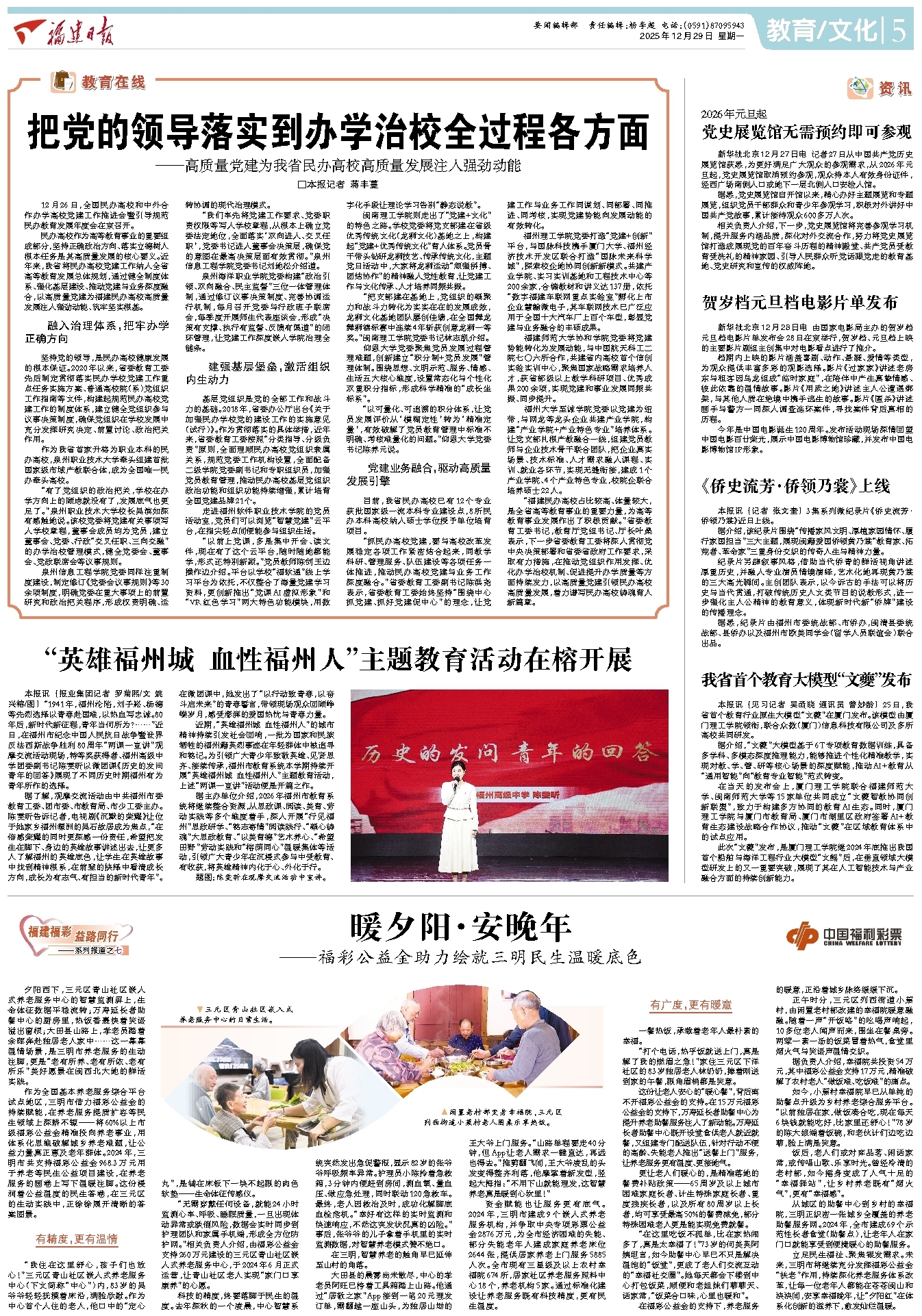 民办高校作为高等教育事业的重要组成部分,坚持正确政治方向、落实立德树人根本任务是其高质量发展的核心要义。近年来,我省将民办高校党建工作纳入全省高等教育发展总体规划,通过健全制度体系、强化基层建设、推动党建与业务深度融合,以高质量党建为福建民办高校高质量发展注入强劲动能、筑牢坚实根基。