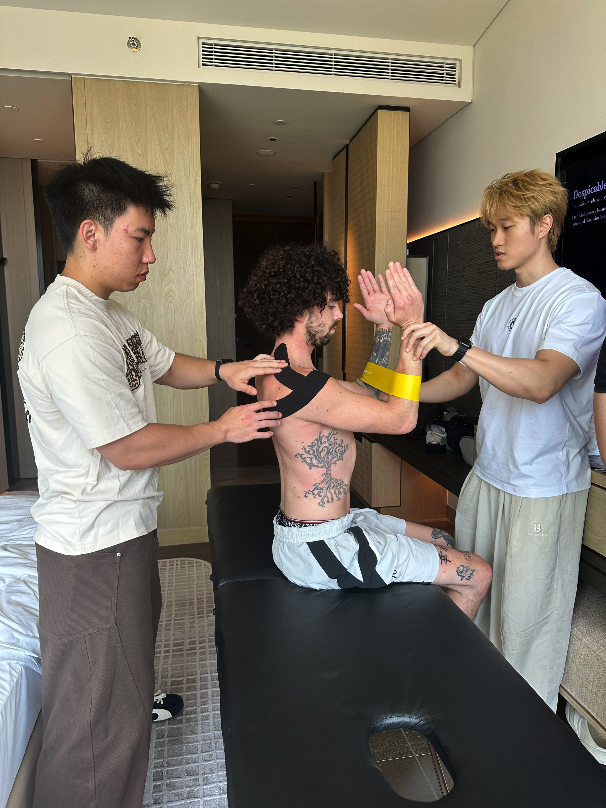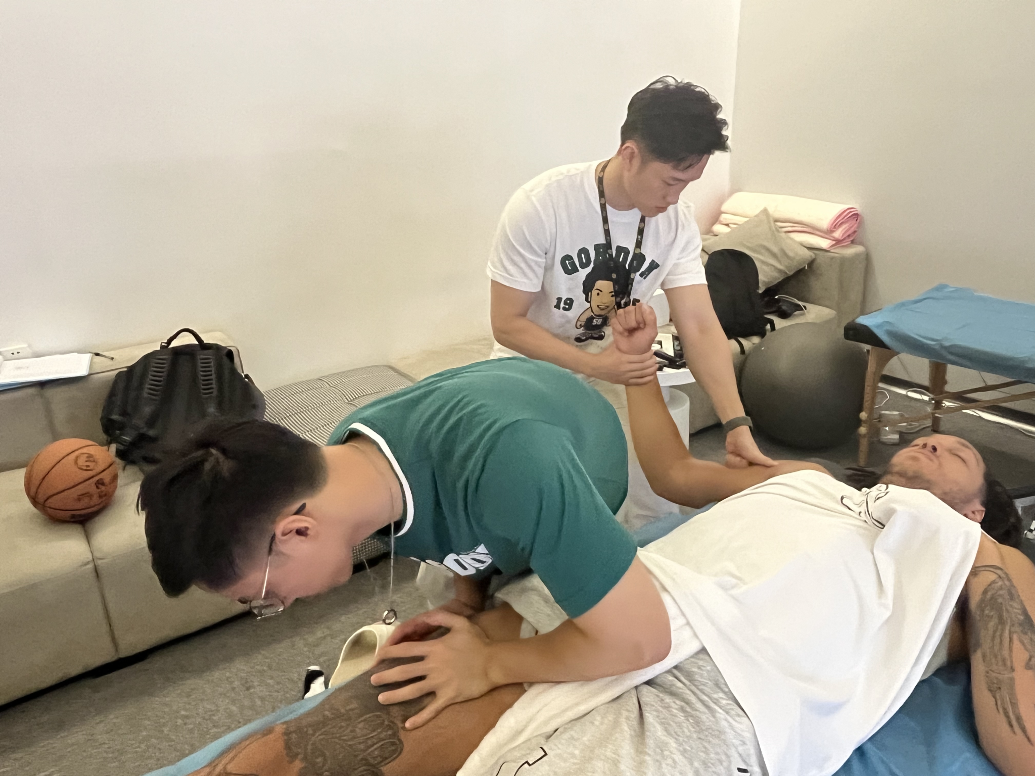 2025年季后赛,戈登带伤作战,拼到左侧腘绳肌拉伤,虽败犹荣,被中国球迷称为“硬汉吕布”。8月21日,他再次开启亚洲之旅,泉大师生受邀为其服务。这一次,师生阵容更强大,章天宇、王雨轩为戈登此行做康复保障,同时,李可超老师作为医疗保障医师、张翔老师作为手法治疗师加入。而学生项盛达、郭栋梁以康复助理身份参与。在此行中,师生不仅在中国为戈登做运动康复,期间还陪伴球星到马来西亚吉隆坡,最后,大家一起回到中国,并在深圳欢送戈登返程。