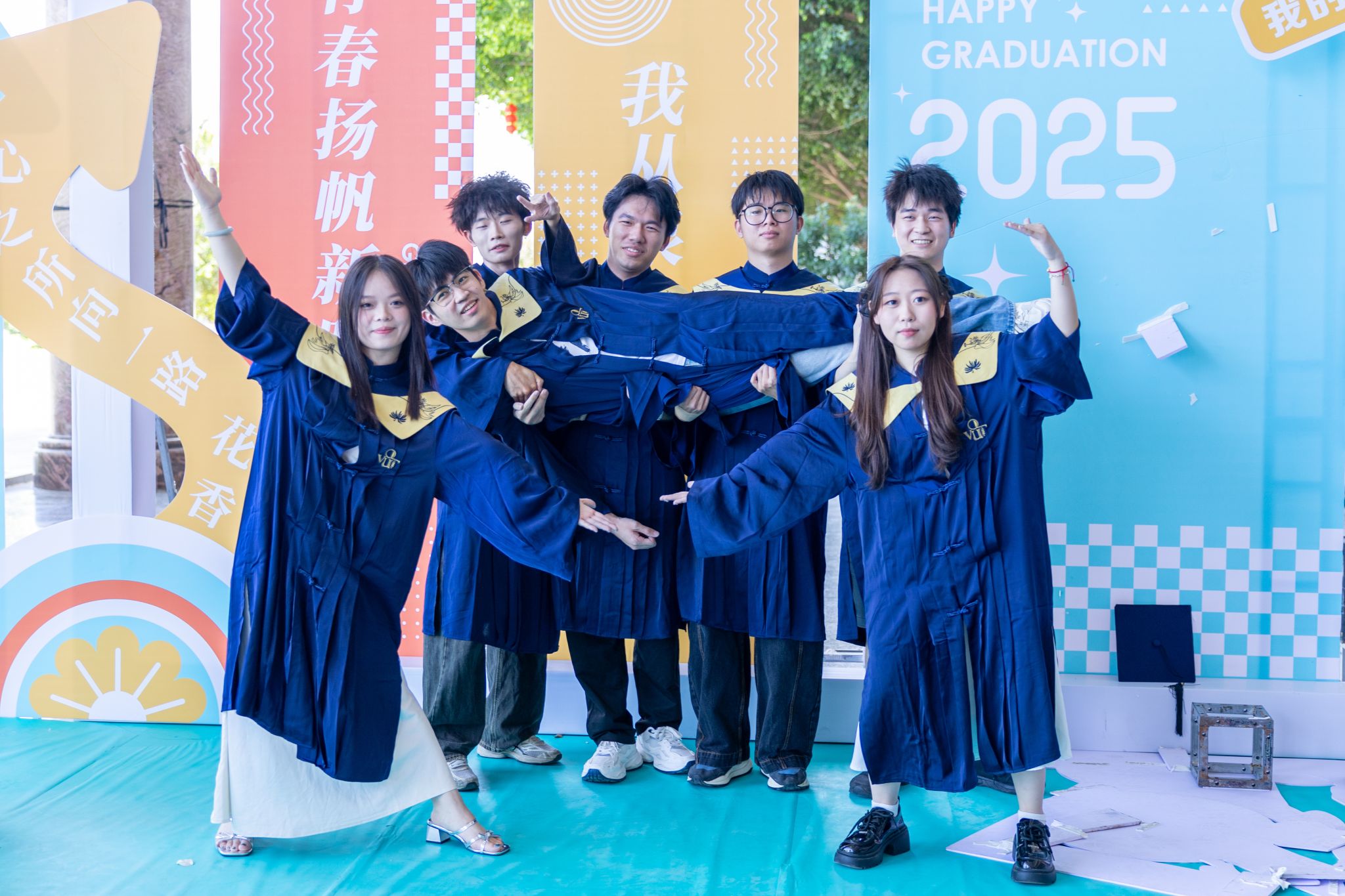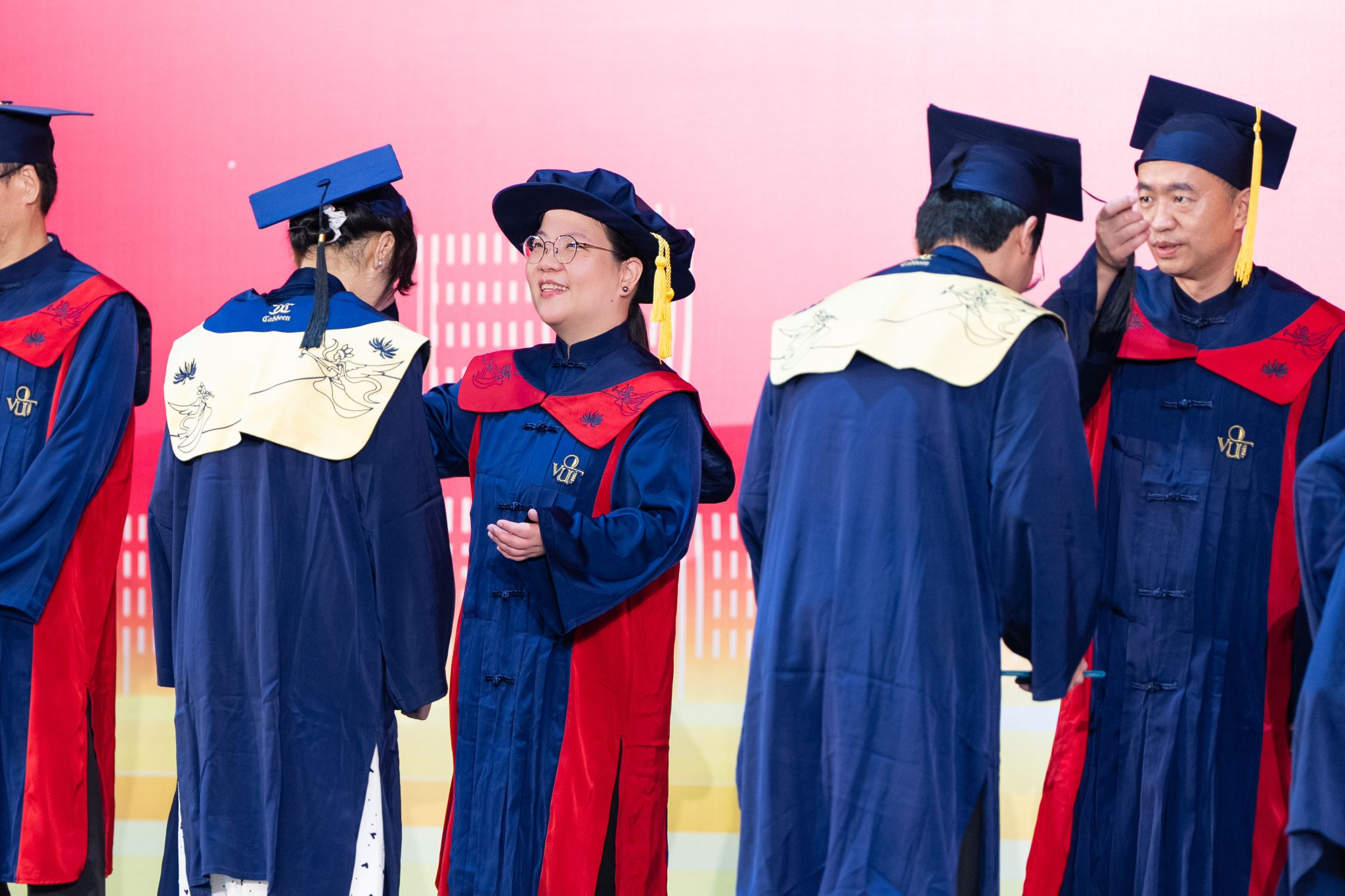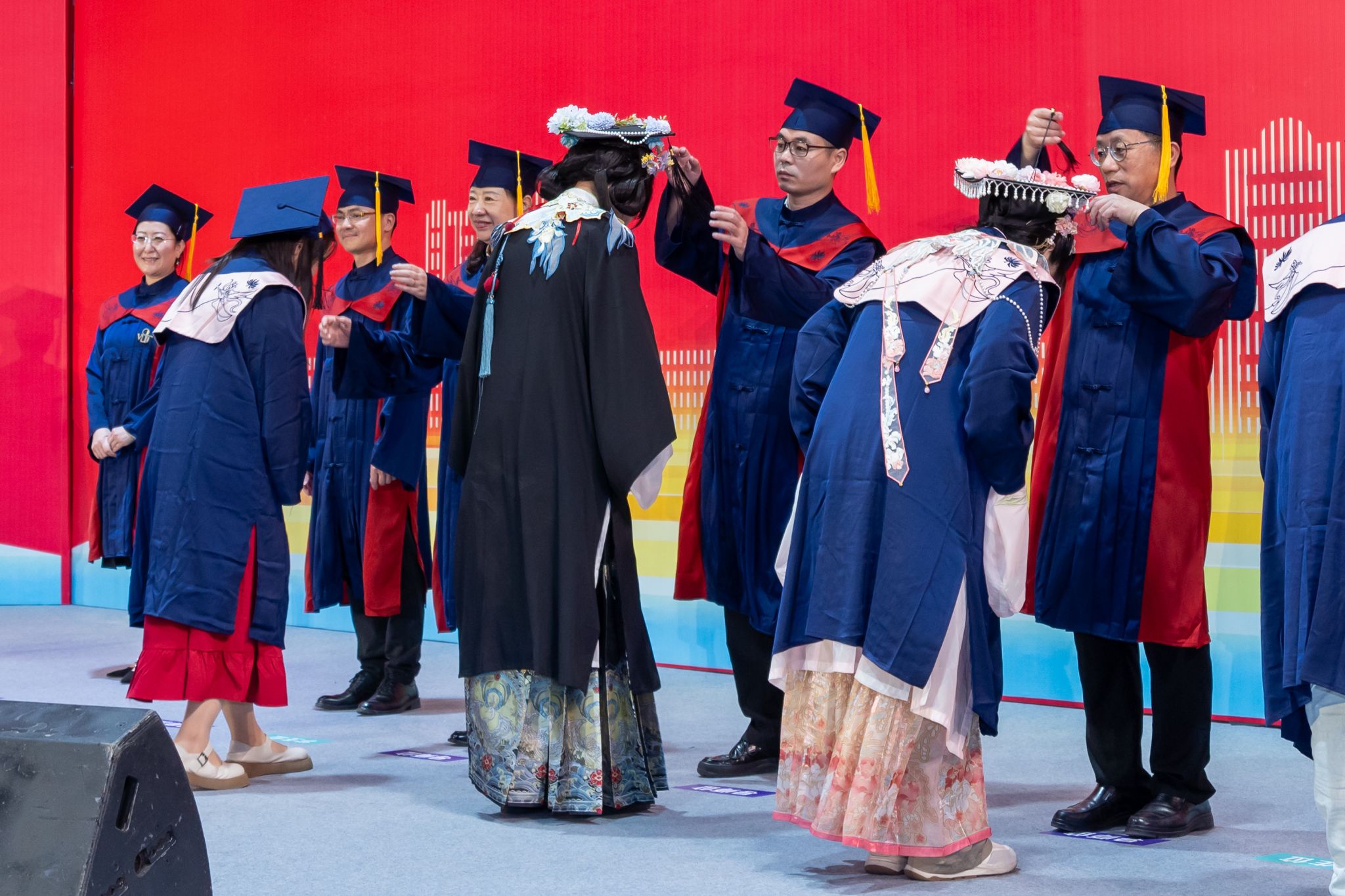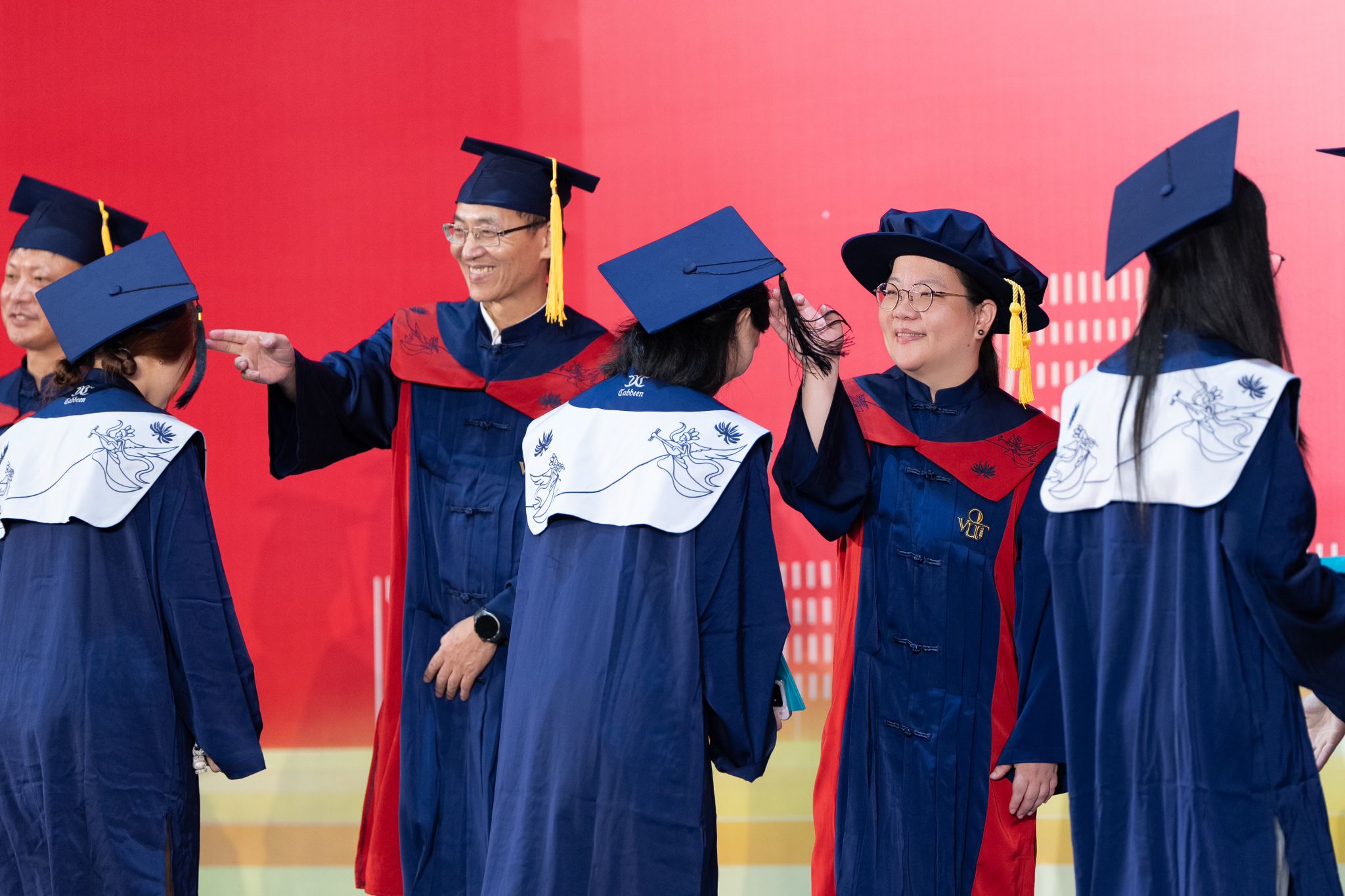 学校学位评定委员会委员、导师上台为获得学士学位的同学拨穗正冠。
