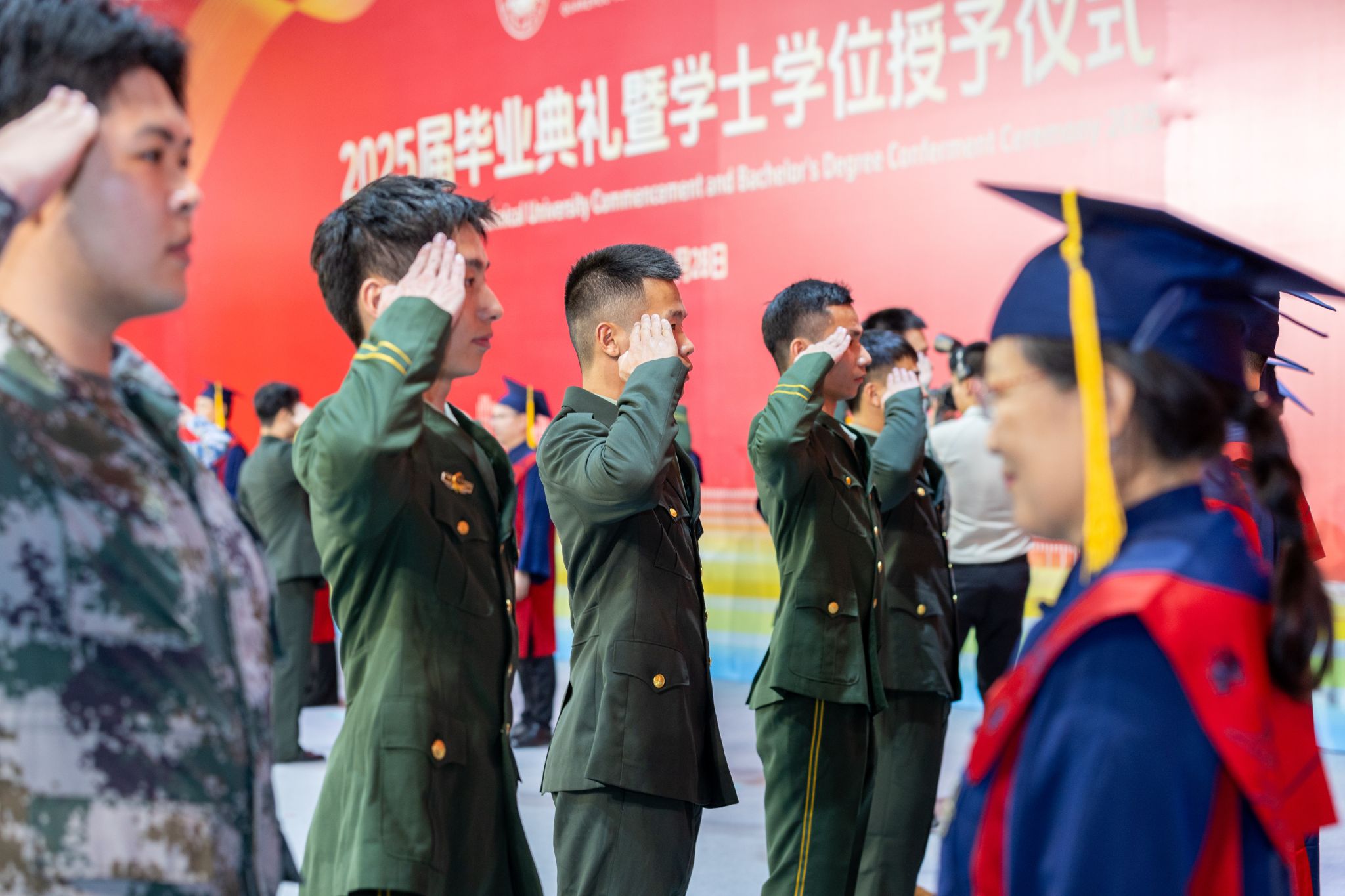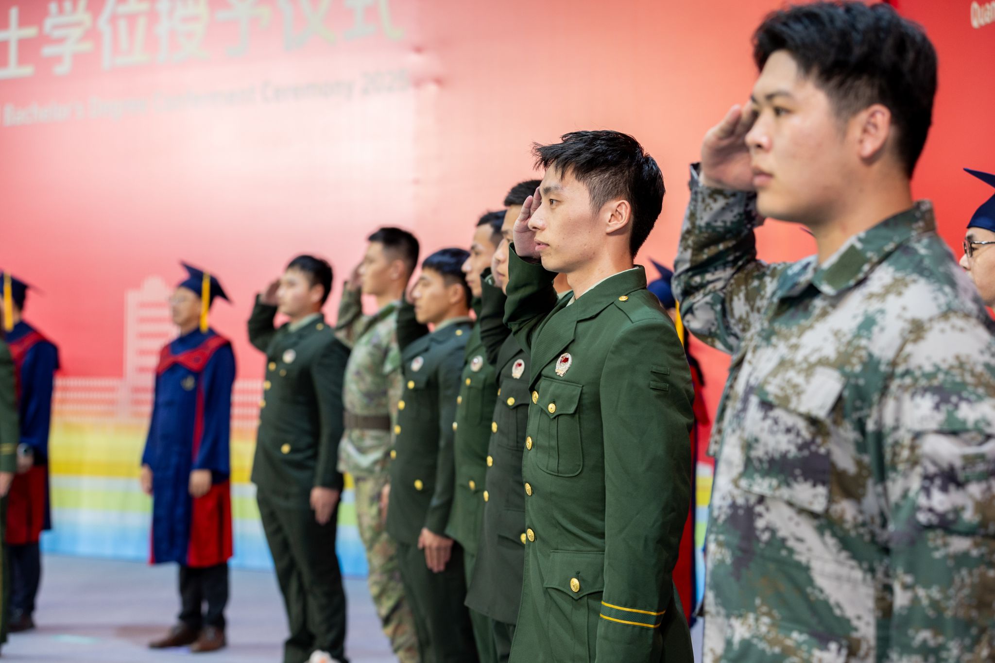 “敬礼!”学士学位授予仪式现场,在拨穗礼毕的瞬间,泉大首个全由退役军人组成的班级2023级休闲体育(专升本)1班的毕业生整齐列队,迅速褪去学士服,身着武警、海陆空三军军装,面向导师与同窗行军礼,勾勒出一段“退伍不褪色”的青春故事。看到这一幕,现场掌声雷动!