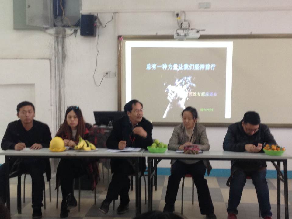 2014年12月3日下午15时30分,泉州理工学院数字传媒系《总有一种力量让我们坚持前行》专题座谈会在教学楼252教室召开,参加本次座谈会的有副校长于雷教授,数字传媒系主任吴景淑教授,黄镇红老师、刘虹燕老师、郑文杰老师以及数媒班全体同学。