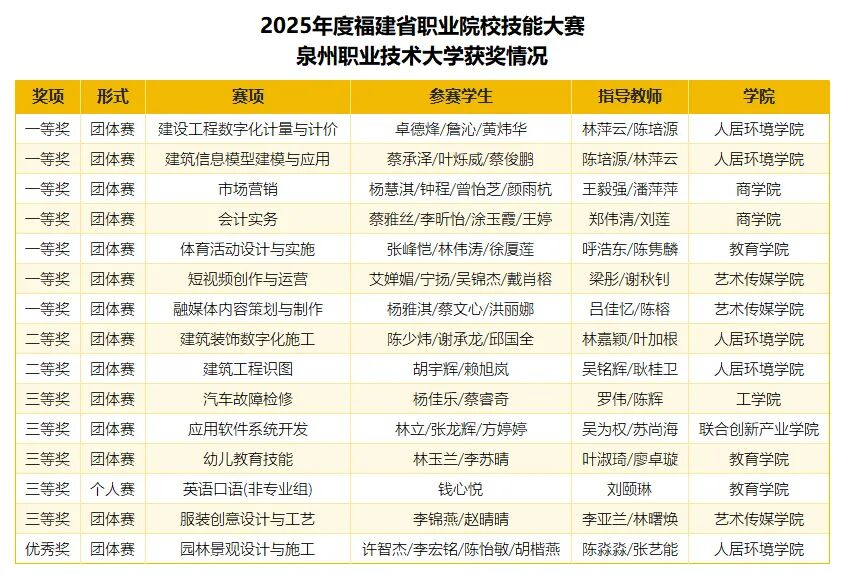 近日,福建省教育厅公布2025年度福建省职业院校技能大赛获奖名单,我校参赛团队在此次大赛中取得优异成绩,共斩获奖项15项,其中一等奖7项、二等奖2项、三等奖5项、优秀奖1项,实现获奖数量与获奖成绩的双突破。