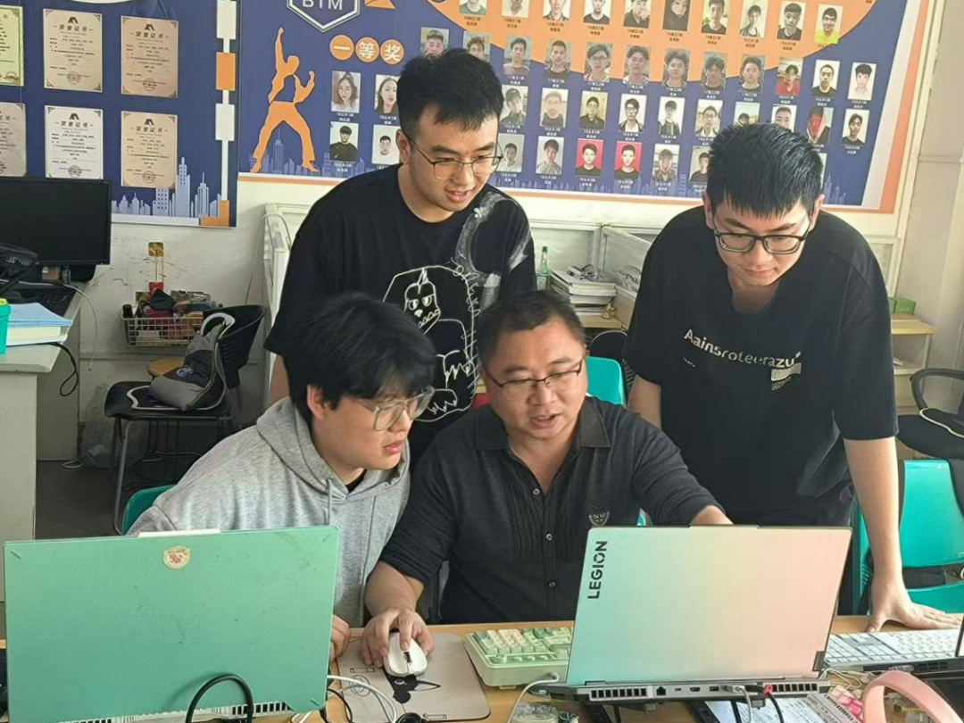 蔡承泽、叶烁威、蔡俊鹏与指导老师陈培源备战建筑信息模型(BIM)建模与应用赛项