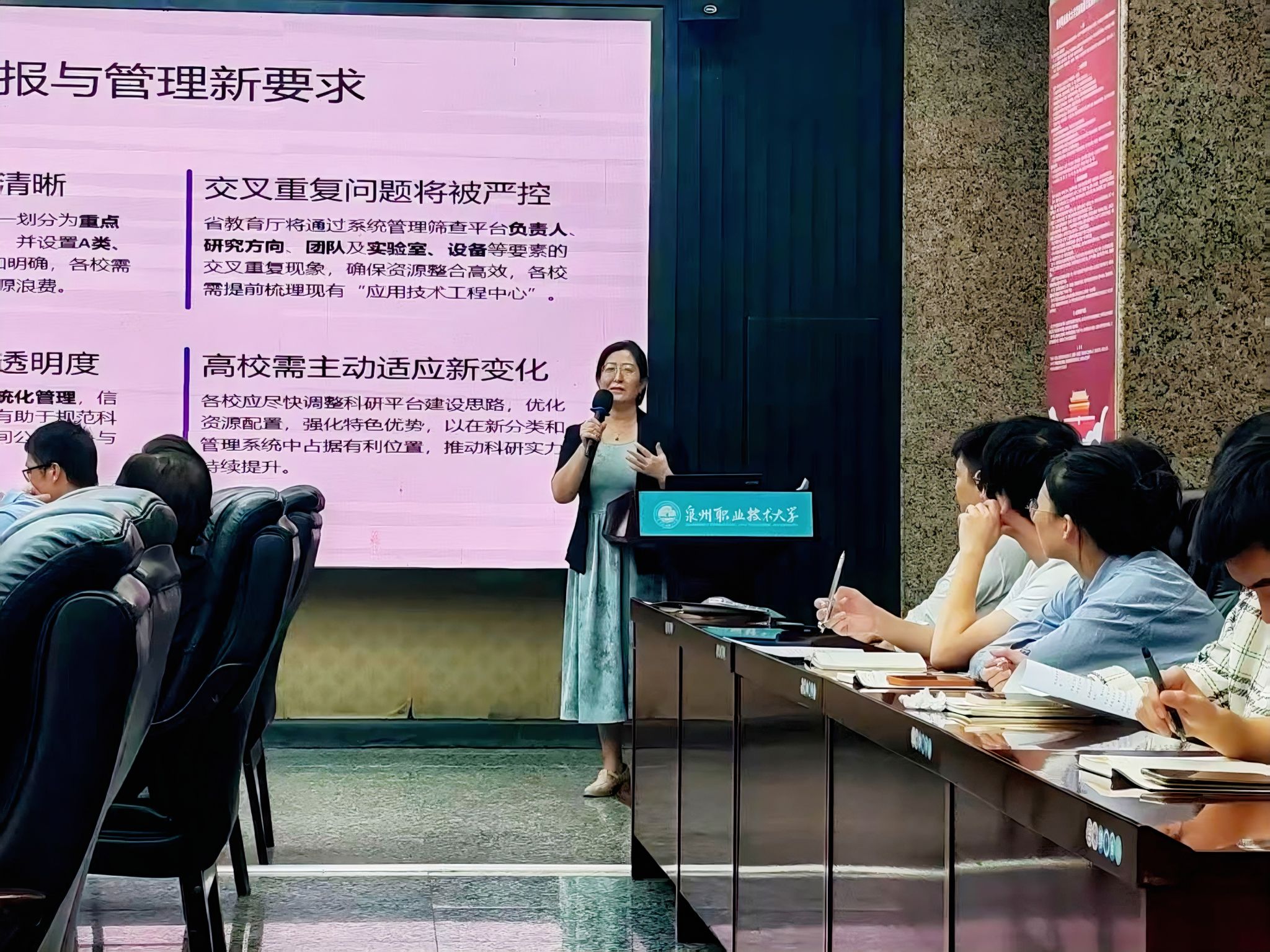 为深入贯彻国家及福建省科研平台建设新导向,落实省教育厅科创平台管理新要求,11月6日下午,泉州职业技术大学在第一会议室召开科研平台专项工作会议。副校长张建军,科研处全体人员,各相关学院负责人、科研平台主任及秘书参加会议。会议由科研处处长任莉娟主持。