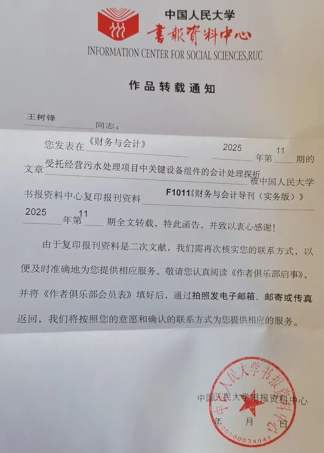 近日,我校商学院大数据与财务管理专业带头人王树锋教授,与晋江市财政局颜彬彬合作撰写的论文《受托经营污水处理项目中关键设备组件的会计处理探析》,在权威核心期刊《财务与会计》2025年6月第11期“业务与技术”专栏发表后,被中国人民大学书报资料中心复印报刊资料F1011《财务与会计导刊(实务版)》2025年第11期全文转载。