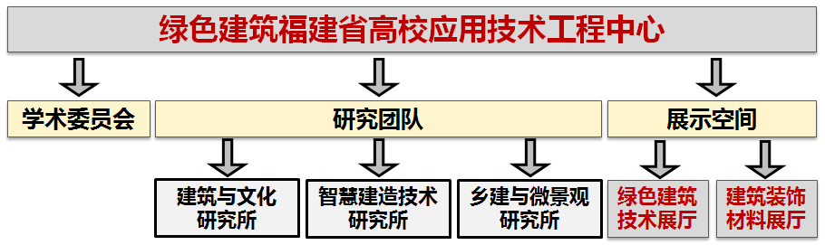 绿色建筑福建省高校应用技术工程中心(简称“绿建中心”)于2017年10月经福建省教育厅批准成立,在校领导及其职能部门的大力支持下已初具规模。建成绿色建筑展厅、绿色建筑材料展示中心、石材学院、BIM研发与应用中心、绿色生态示范工程研究室等多个机构,建筑面积近600平方米。此外,与人居环境学院共享研究人员及其各类实验室。2023年绿建中心开始面对校外校内设置开放课题,共立项4项,资助经费共计14万元。