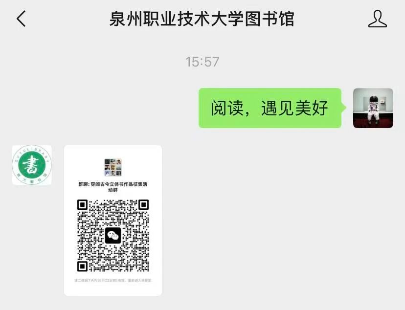 注意:如微信群二维码过期,可关注泉州职业技术大学图书馆微信公众号发送“阅读,遇见美好”获取最新二维码。