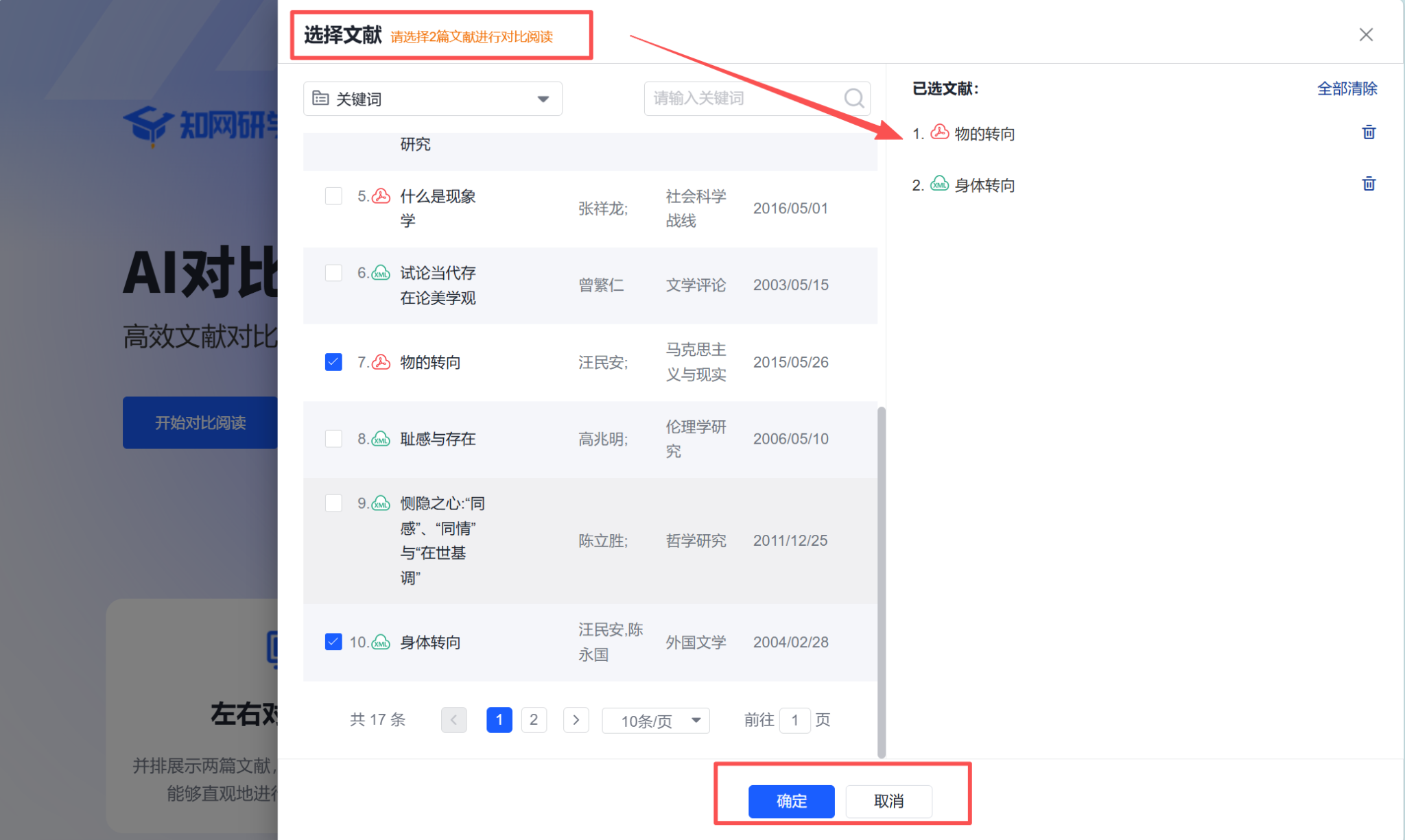 在自己的文献专题库中选择两篇需要对比的文献,它们会自动出现在右侧的【已选文献】中,点击【确定】就能进入对比页面。
