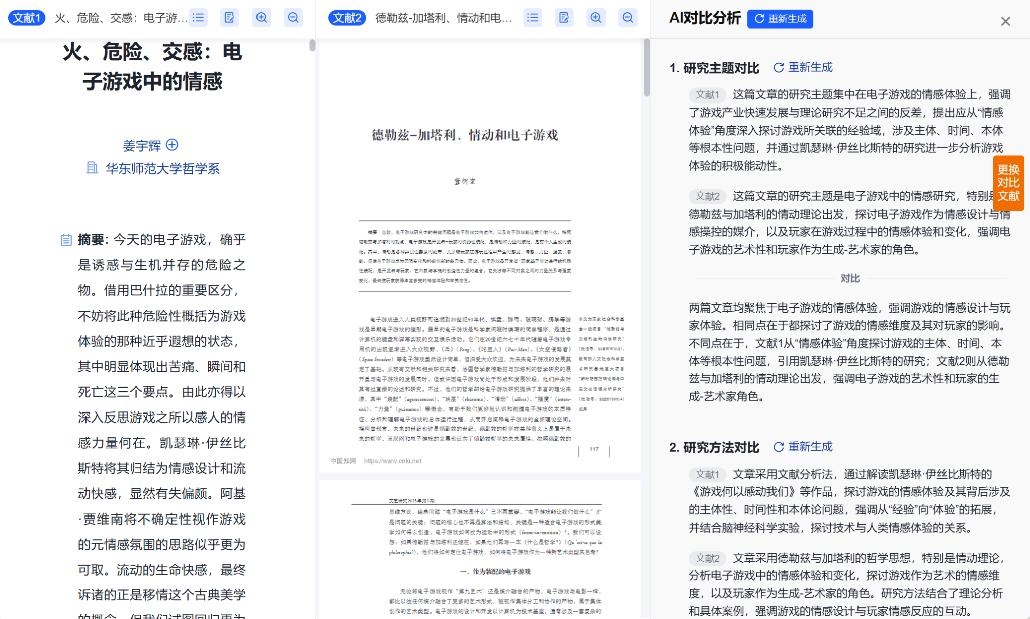页面采用左右对照模式,两篇文献并排展示,可以同步滚动,直观对比原文细节。右侧AI会自动生成对比分析报告:从研究主题、研究方法、研究结论、创新点、理论贡献、应用价值6个维度,把两篇文献的相同点和不同点拆解得明明白白。