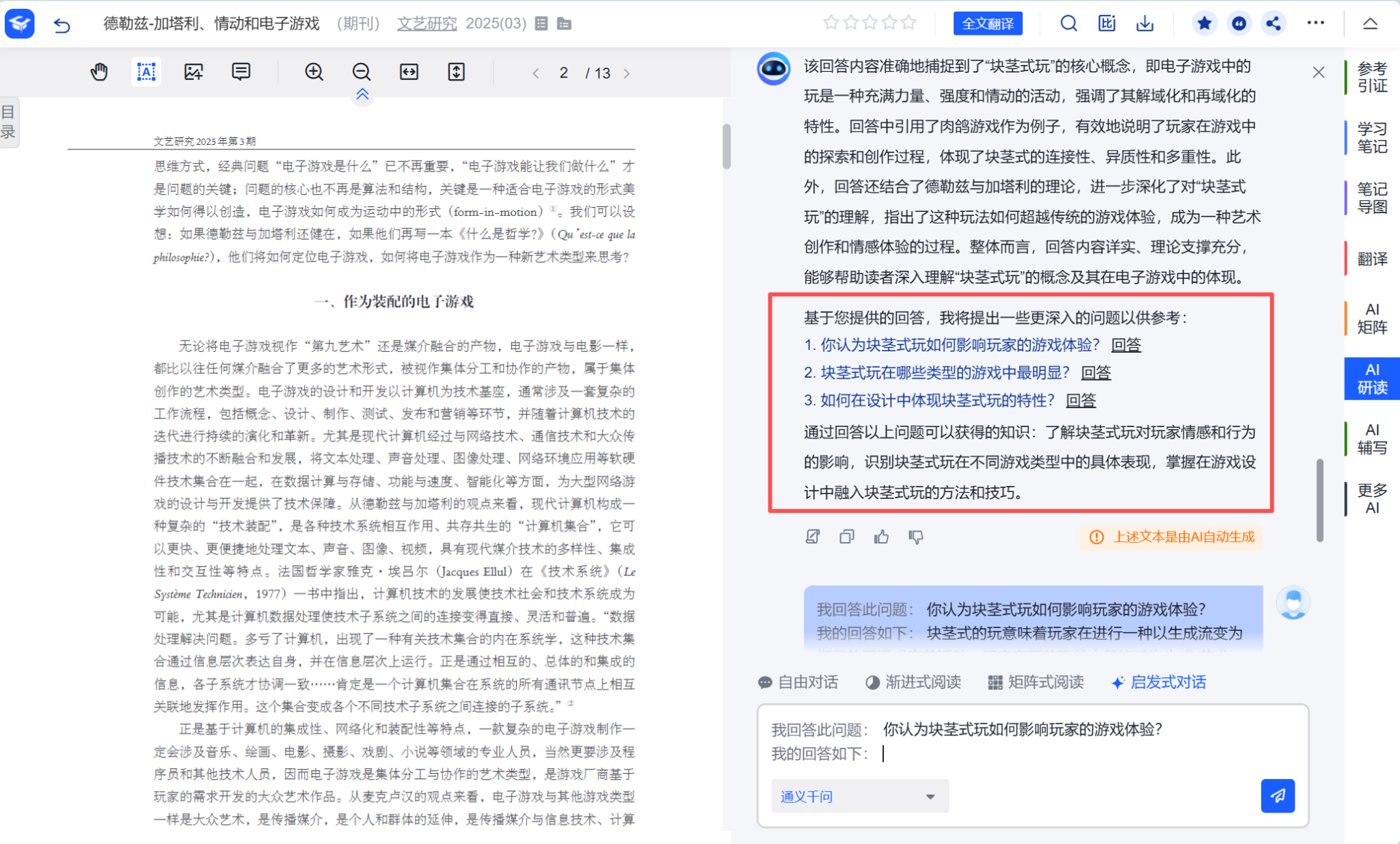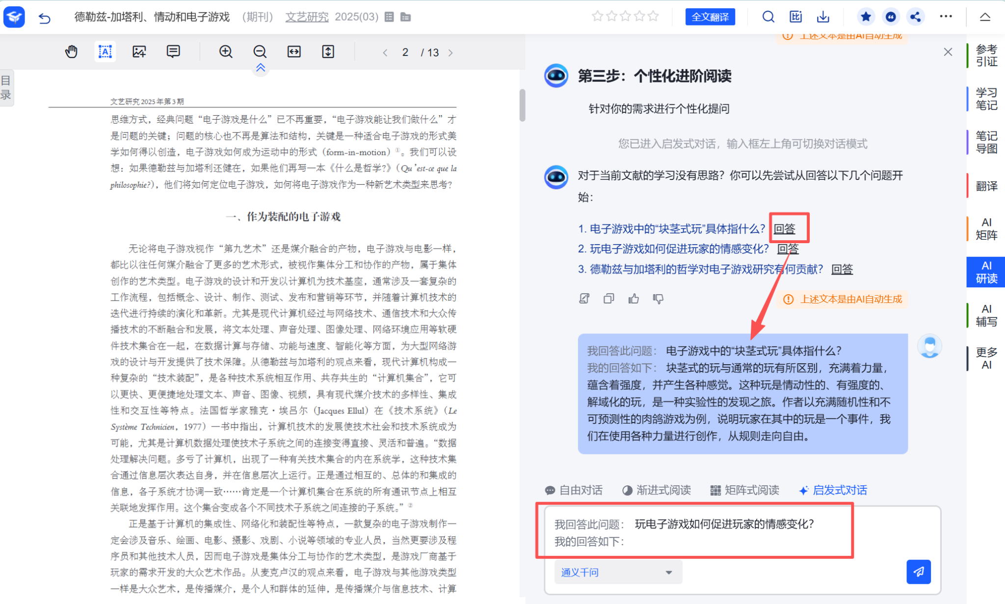 它不是直接给你答案,而是通过“提问→回答→再追问” 的闭环,引导你主动拆解文献、深化理解,真正把知识内化成自己的。