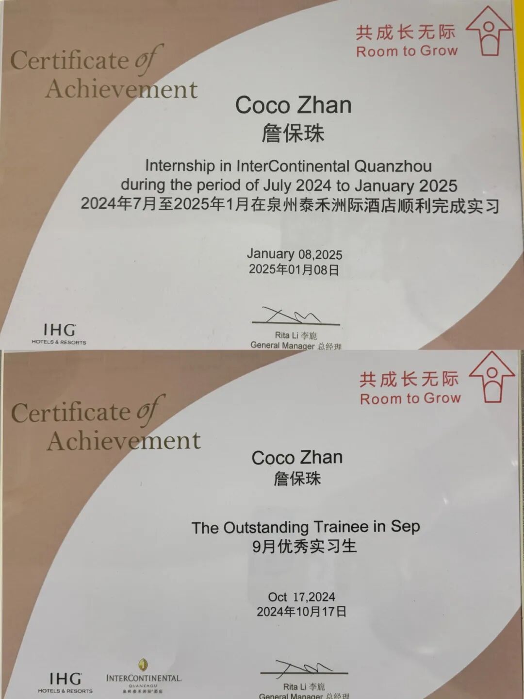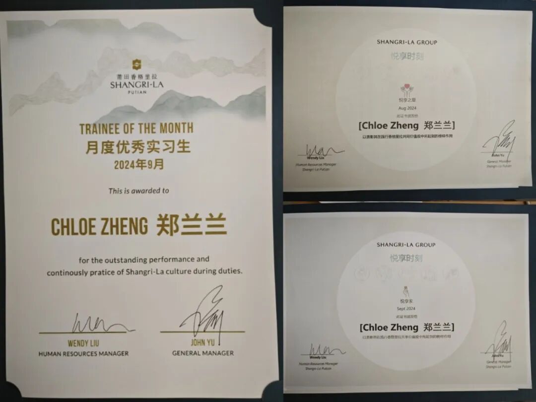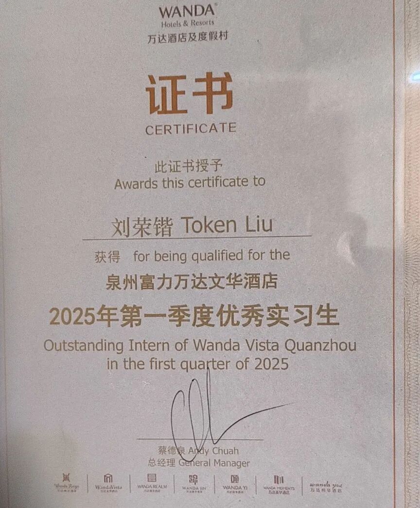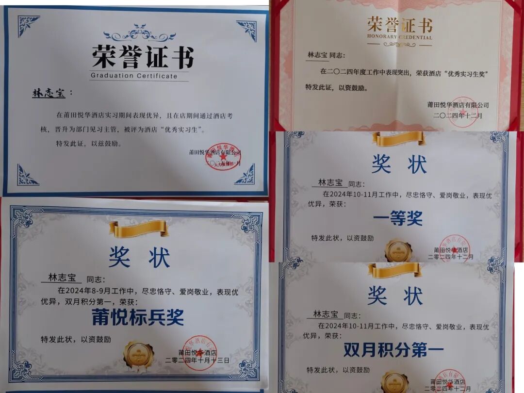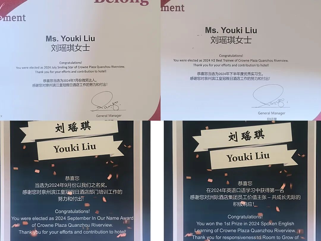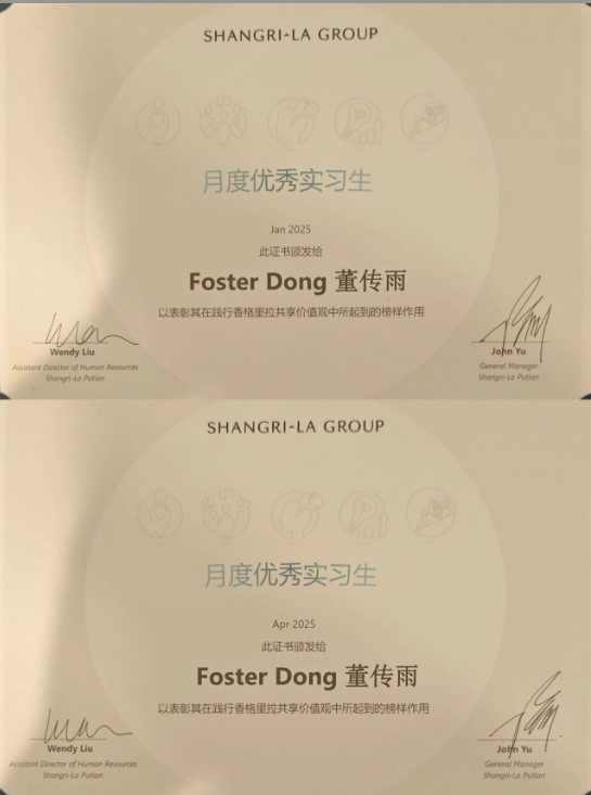 很荣幸在实习期间能够获得这些奖项,这是对我实习工作努力的肯定。感谢公司提供的宝贵机会,让我在实践中学习成长;感谢各位专业导师的悉心指导;也感谢团队同事们的支持与帮助。这份荣誉让我备受鼓舞,未来我将继续努力,提升专业技能,为酒店行业的发展贡献自己的力量。
