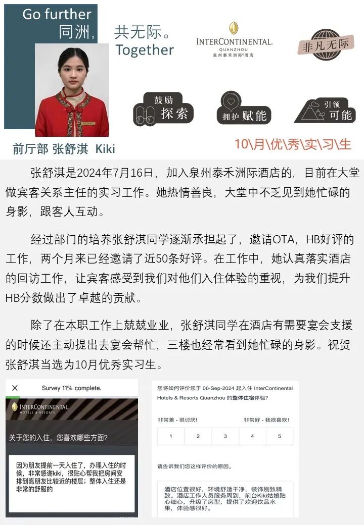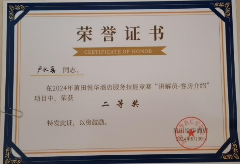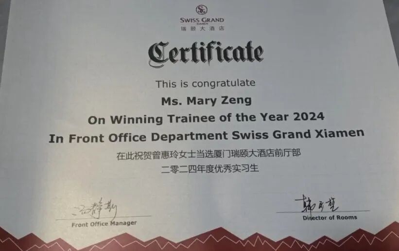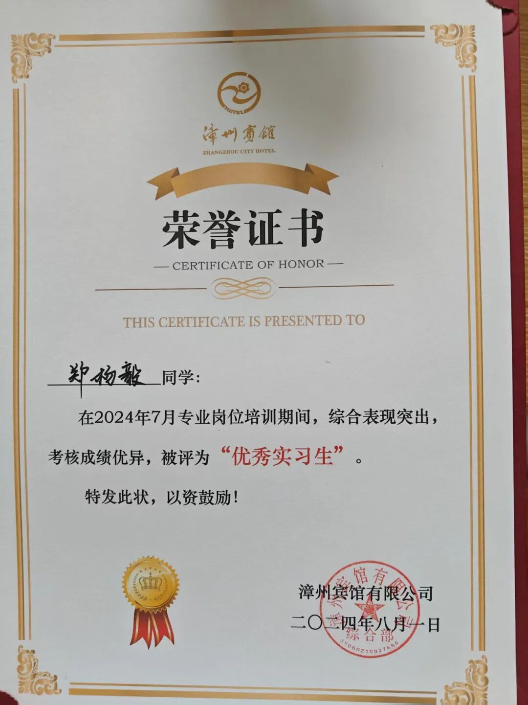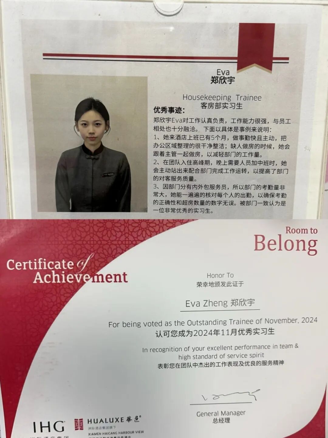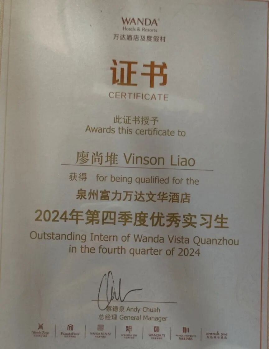 很荣幸在实习期间能够获得这些奖项,这是对我实习工作努力的肯定。感谢公司提供的宝贵机会,让我在实践中学习成长;感谢各位专业导师的悉心指导;也感谢团队同事们的支持与帮助。这份荣誉让我备受鼓舞,未来我将继续努力,提升专业技能,为酒店行业的发展贡献自己的力量。
