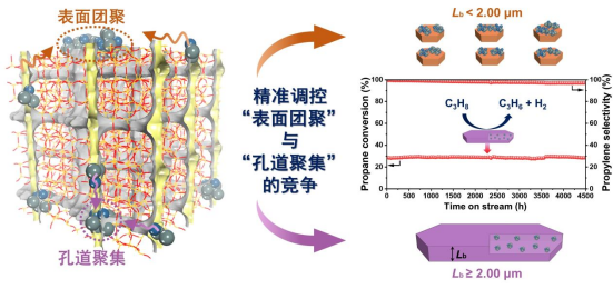 该研究团队首次发现MFI分子筛封装的铂粒子的稳定性与其b轴长度密切相关。当b轴长度大于2微米时,扩散路径较长致使铂粒子在分子筛孔道内发生聚集而长大,长大的铂粒子最终被“卡”在孔道中并被牢固锁定,从而避免了铂粒子的团聚失活。基于上述发现,团队提出通过分子筛孔道限域实现铂粒子的“扩散—聚集—自锁”,创制出具有抗烧结性能的超稳定性丙烷脱氢铂基催化剂。