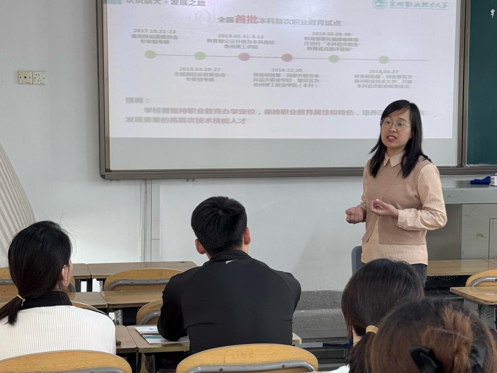 宣讲会伊始,郑春梅副处长详细介绍了泉州职业技术大学的校园文化、发展历程以及人才培养方向。她强调,泉州职业技术大学始终秉持“以人为本、追求卓越”的办学理念,致力于为每一位教职工提供广阔的发展平台和良好的职业环境。