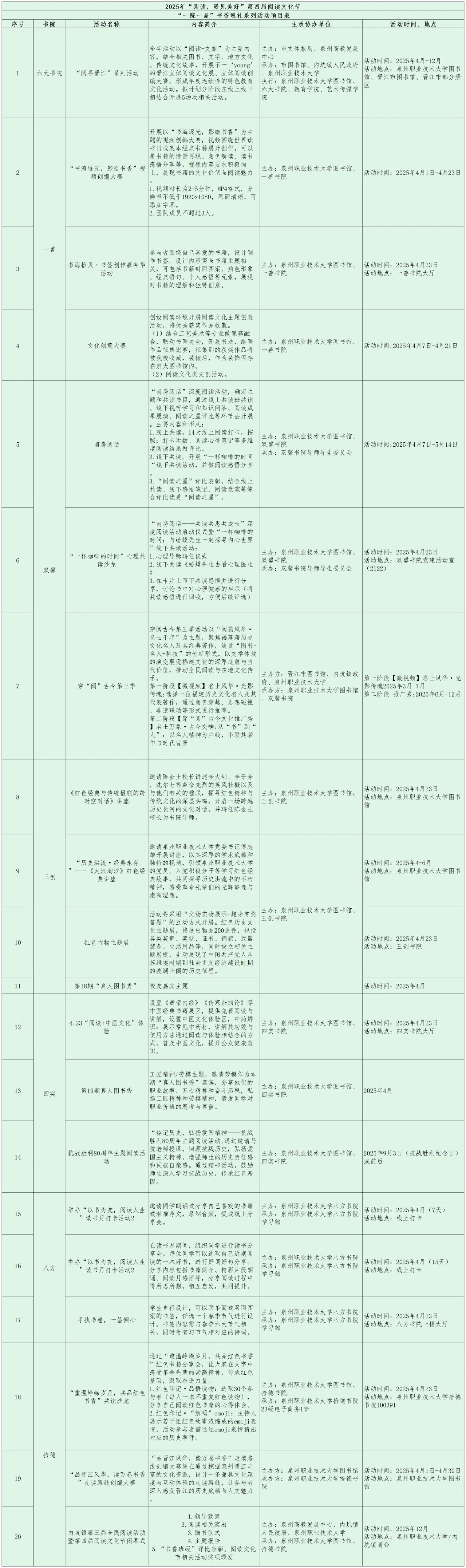 为倡导全民阅读,营造好读书、读好书的读书氛围,丰富学校的文化底蕴,发挥学生在引领阅读风尚、构建学习型社会中的重要作用。图书馆以“阅读,遇见美好”为主题,与六大书院共融共创,通过推出“一院一品”书香巡礼系列活动,打造校内阅读文化新矩阵,助推我校书香校园建设,共推出20项活动。