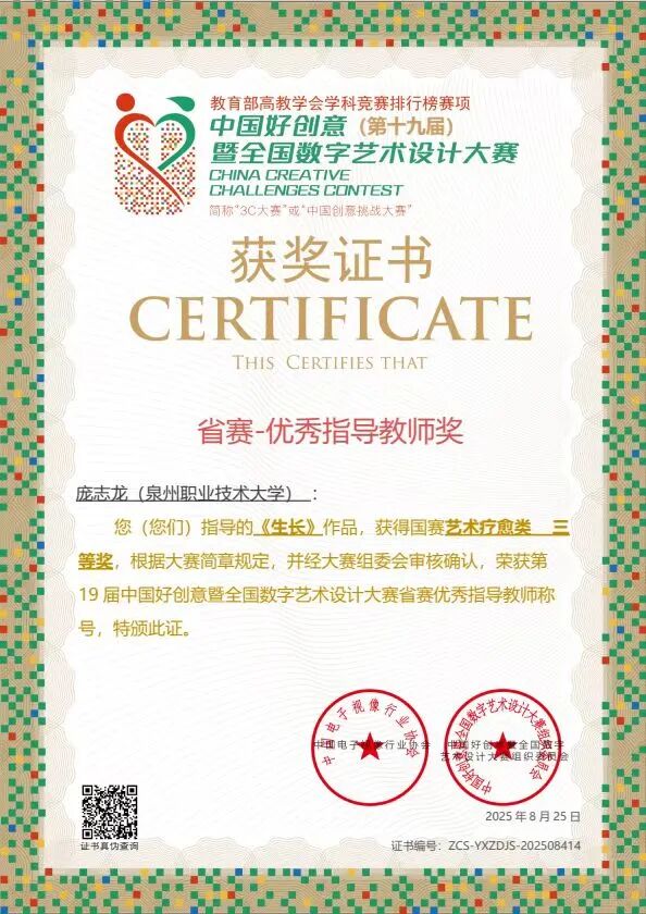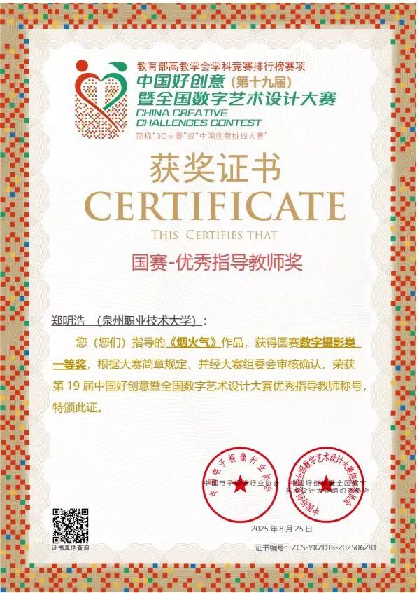 同时,在指导教师奖项方面,郑明浩老师凭借指导作品《烟火气》,荣获国赛优秀指导教师奖(数字摄影类国赛一等奖);庞志龙老师因指导作品《生长》,获得省赛优秀指导教师奖(艺术疗愈类国赛三等奖)。正是有这些优秀指导教师的引领,同学们才能在竞赛中不断突破,展现出专业的实力与创意的风采。
