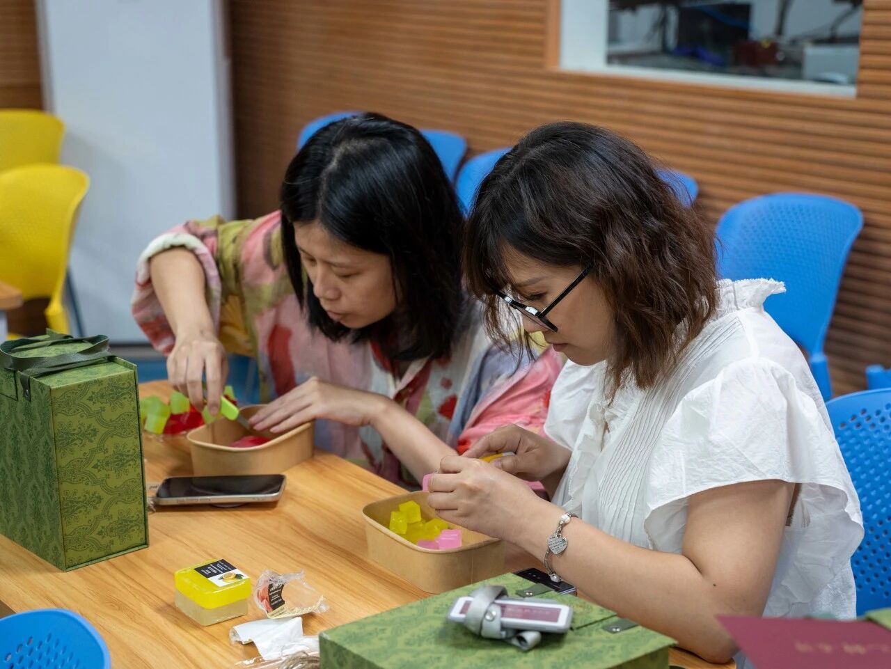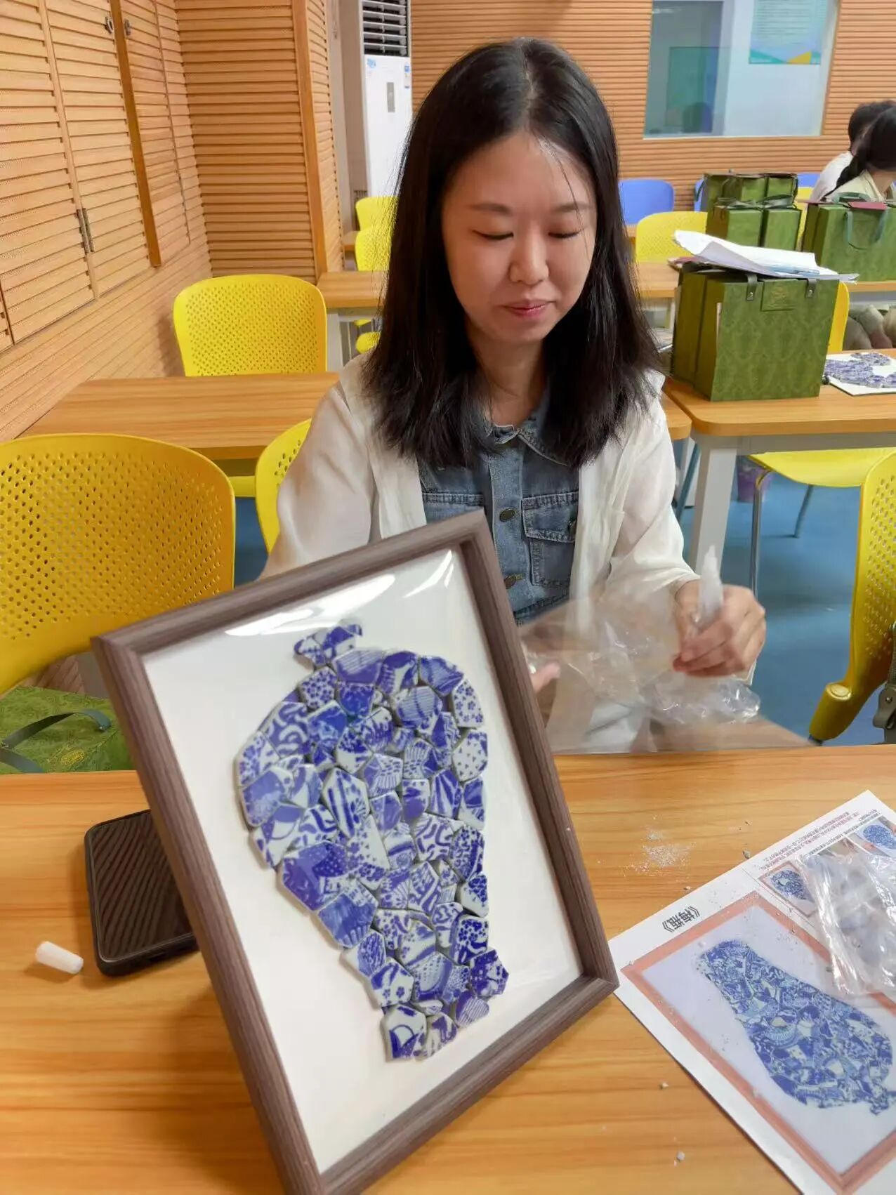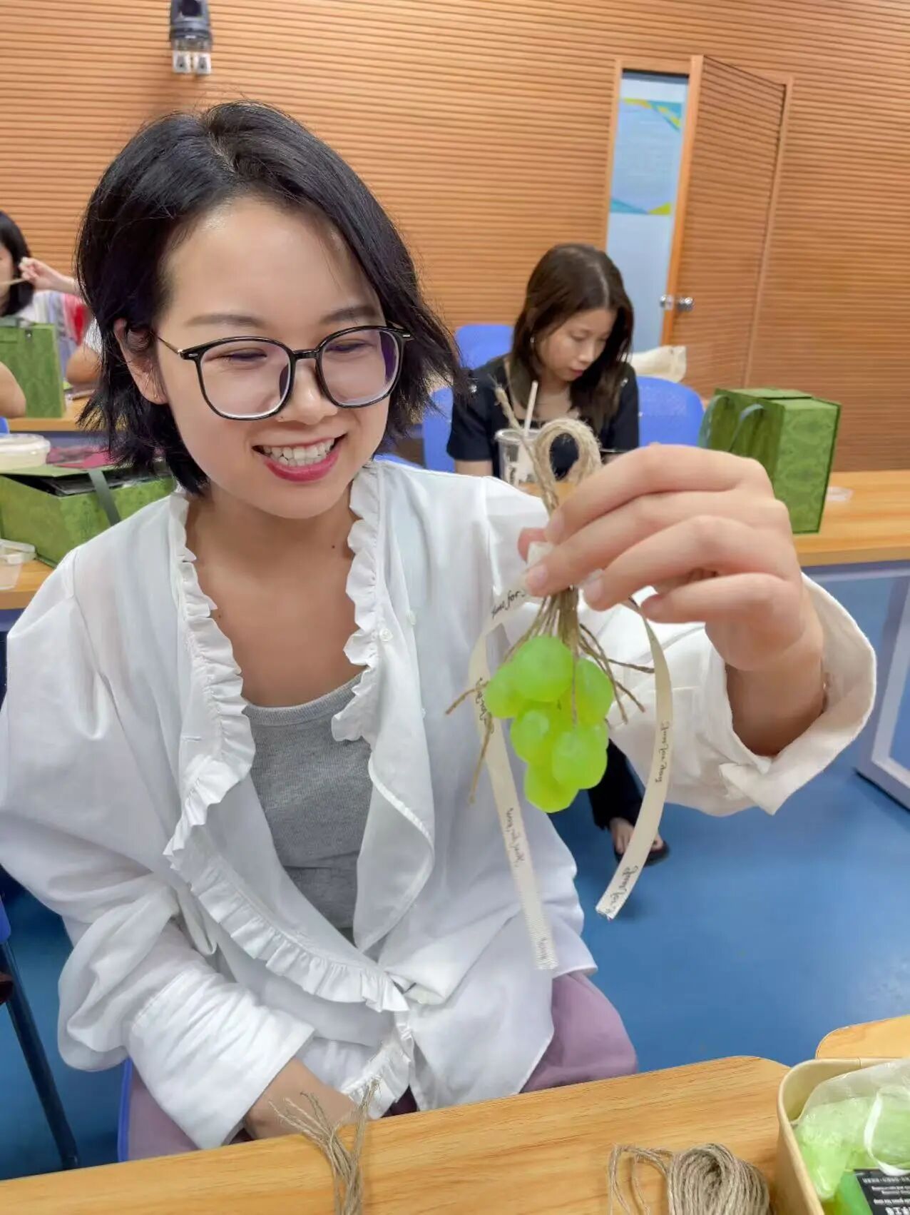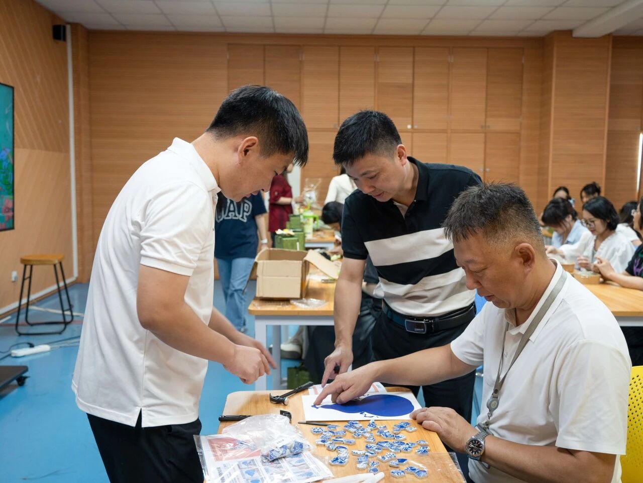 主题分享结束后,充满趣味的教师节手工体验活动紧接着拉开帷幕,三大项手工体验环节的特色项目吸引老师们参与其中:传统手工皂制作区以 “水晶葡萄香皂 DIY” 为核心,通过分层注模、细节刻画,将透明原料制成饱满剔透、兼具观赏性与实用性的香皂;青花瓷艺术画区域巧用景德镇碎瓷片,参与者经挑选、拼接、粘贴,将零散瓷片组合成含传统韵味与创意的作品,让陶瓷文化焕新;扎染艺术扇制作现场,大家借捆扎、染色工艺,让素白扇面呈现独特蓝白花纹,作品尽显传统手工艺的趣味与感染力。