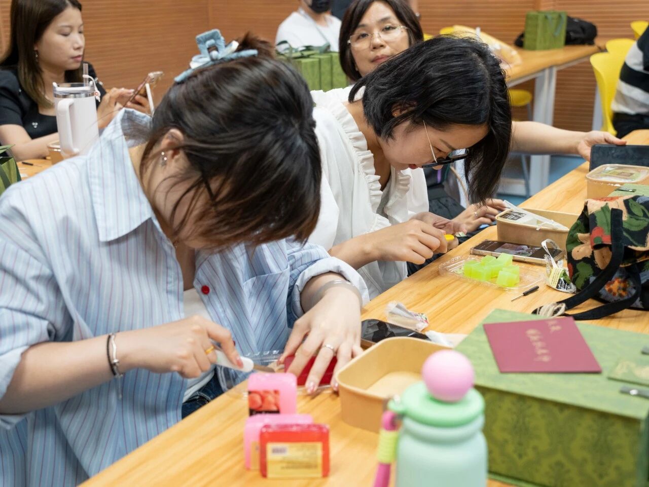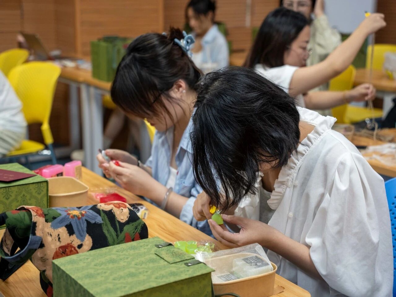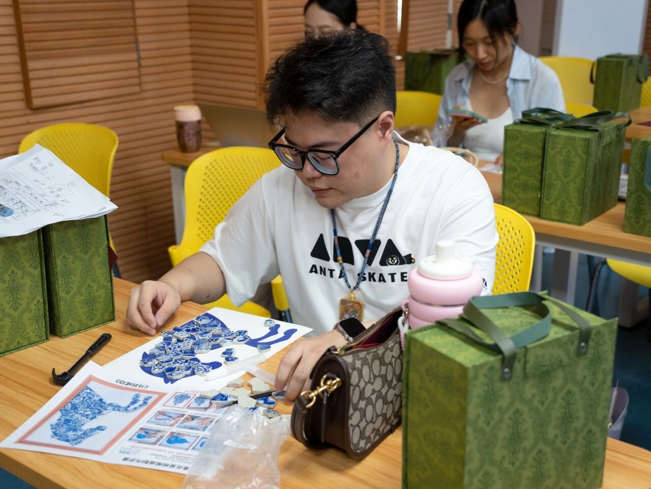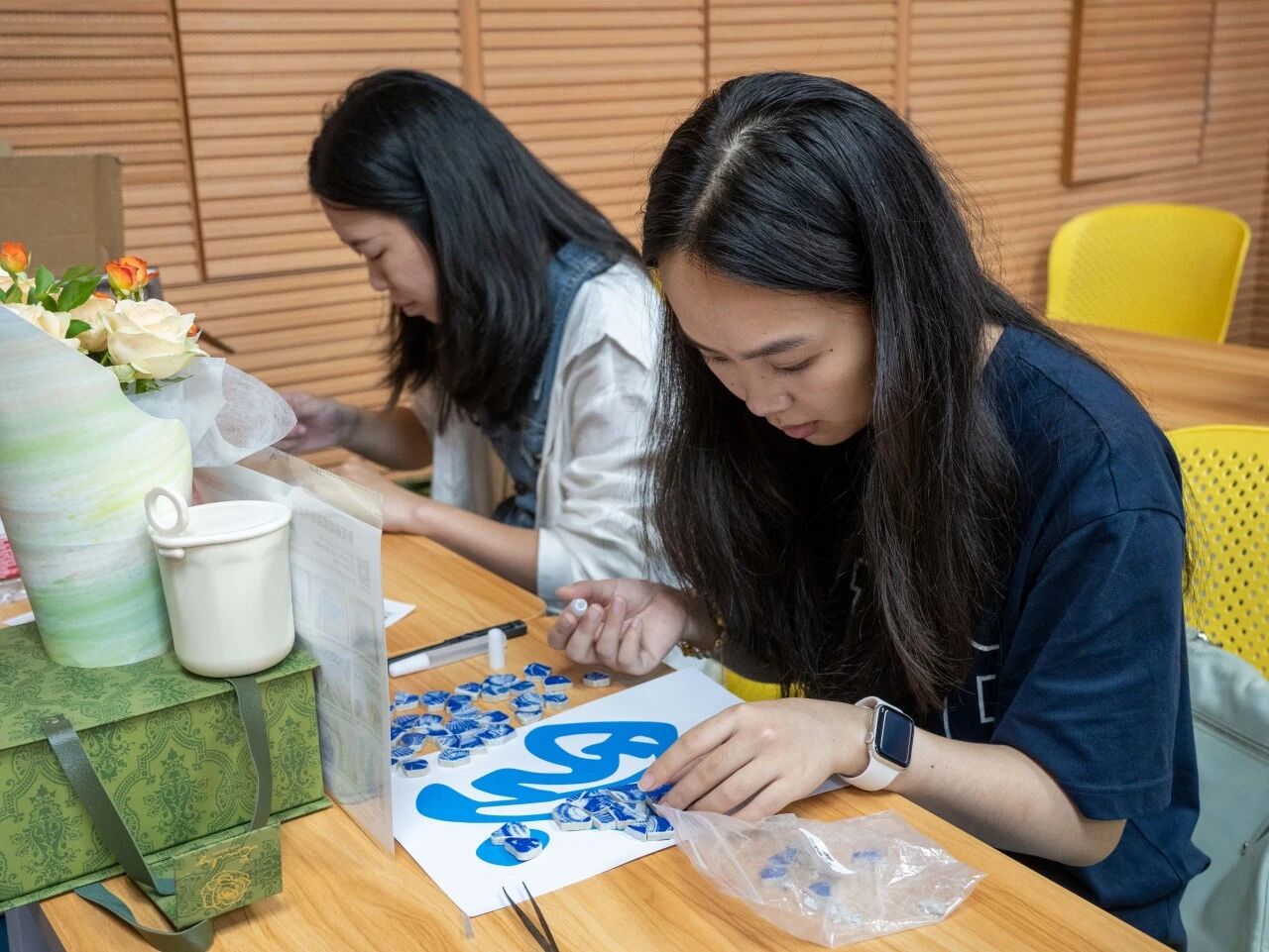 主题分享结束后,充满趣味的教师节手工体验活动紧接着拉开帷幕,三大项手工体验环节的特色项目吸引老师们参与其中:传统手工皂制作区以 “水晶葡萄香皂 DIY” 为核心,通过分层注模、细节刻画,将透明原料制成饱满剔透、兼具观赏性与实用性的香皂;青花瓷艺术画区域巧用景德镇碎瓷片,参与者经挑选、拼接、粘贴,将零散瓷片组合成含传统韵味与创意的作品,让陶瓷文化焕新;扎染艺术扇制作现场,大家借捆扎、染色工艺,让素白扇面呈现独特蓝白花纹,作品尽显传统手工艺的趣味与感染力。