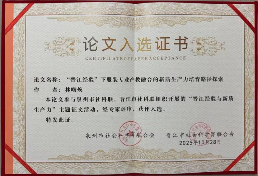 其中,我院数字媒体艺术专业邓洁莹副教授的《新质生产力驱动下数字媒体艺术专业产教融合模式创新研究 —— 基于 “一课双师” 的实践探索》与服装与服饰设计专业林曙焕老师的《“晋江经验” 下服装专业产教融合的新质生产力培育路径探索》经专家评审成功获评入选。