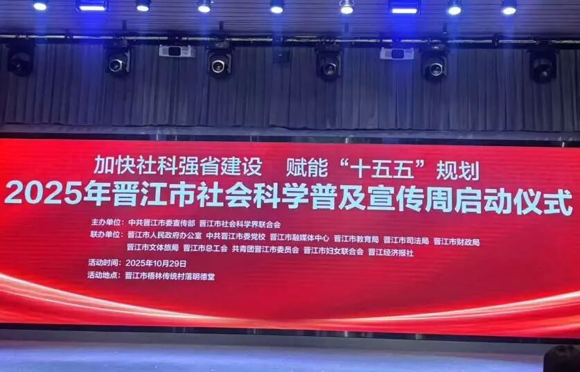 10月29日上午,2025年晋江市社科普及宣传周启动。此次活动以“加快社科强省建设 赋能‘十五五’规划”为主题,全市将组织开展59项内容丰富、形式多样的社科普及活动。晋江市领导黄少伟出席启动仪式。