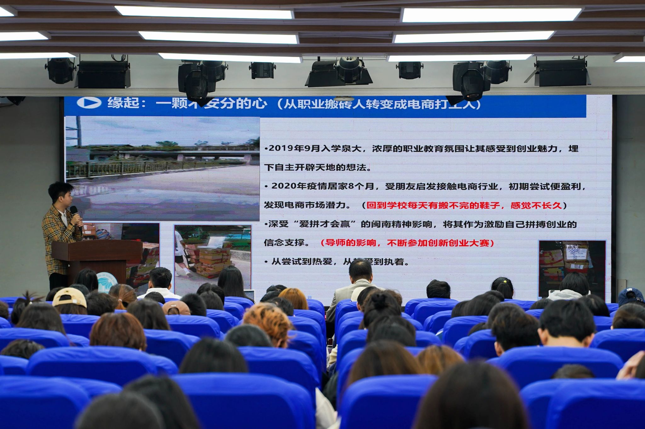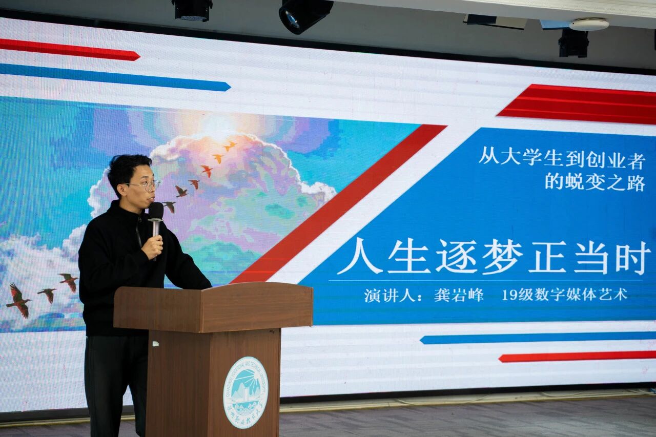在核心分享环节,龚岩峰校友结合自身亲身经历,从创业初心、创业历程、创业感悟、经验总结四个关键方面展开深入讲解。他真诚地分享了创业过程中遇到的挑战与机遇,复盘了成长路上的关键抉择,为在场师生传递了宝贵的实战经验。