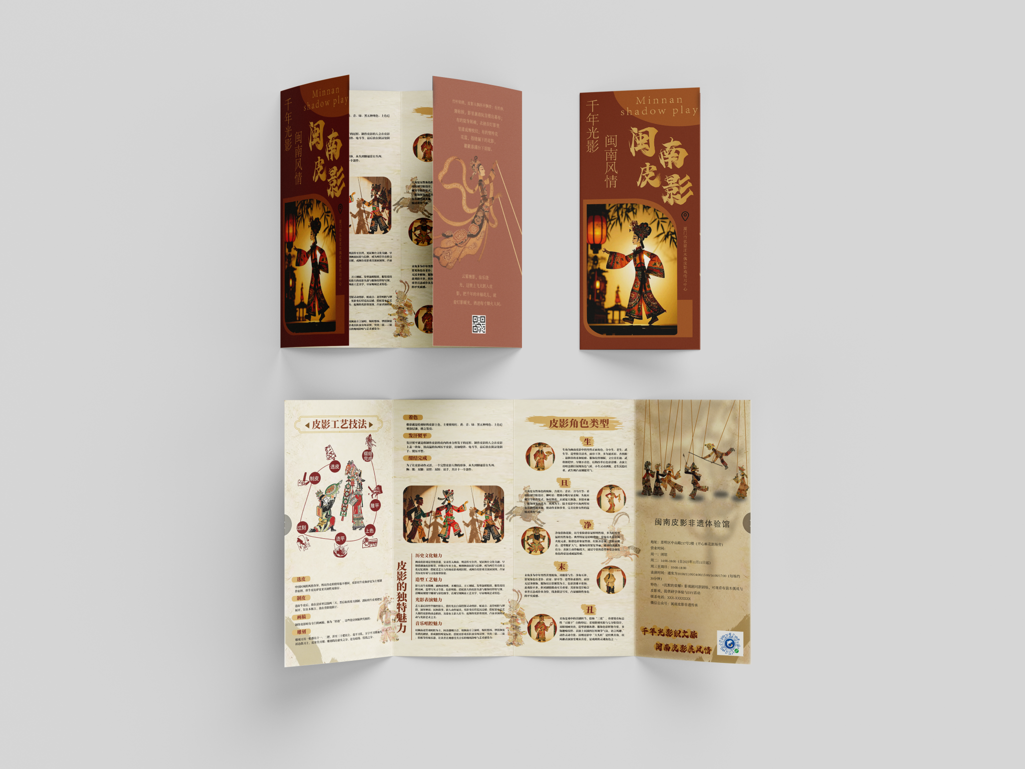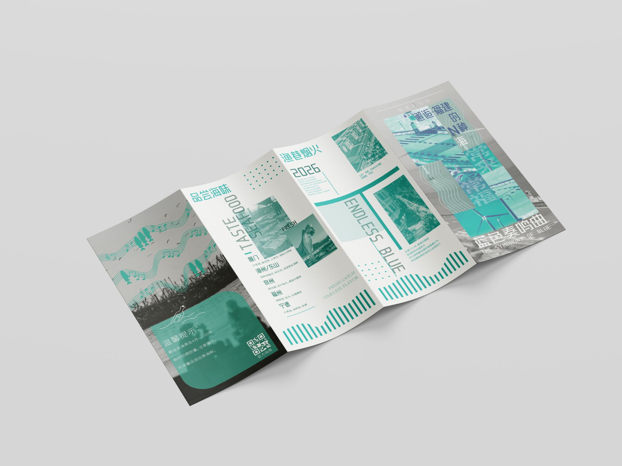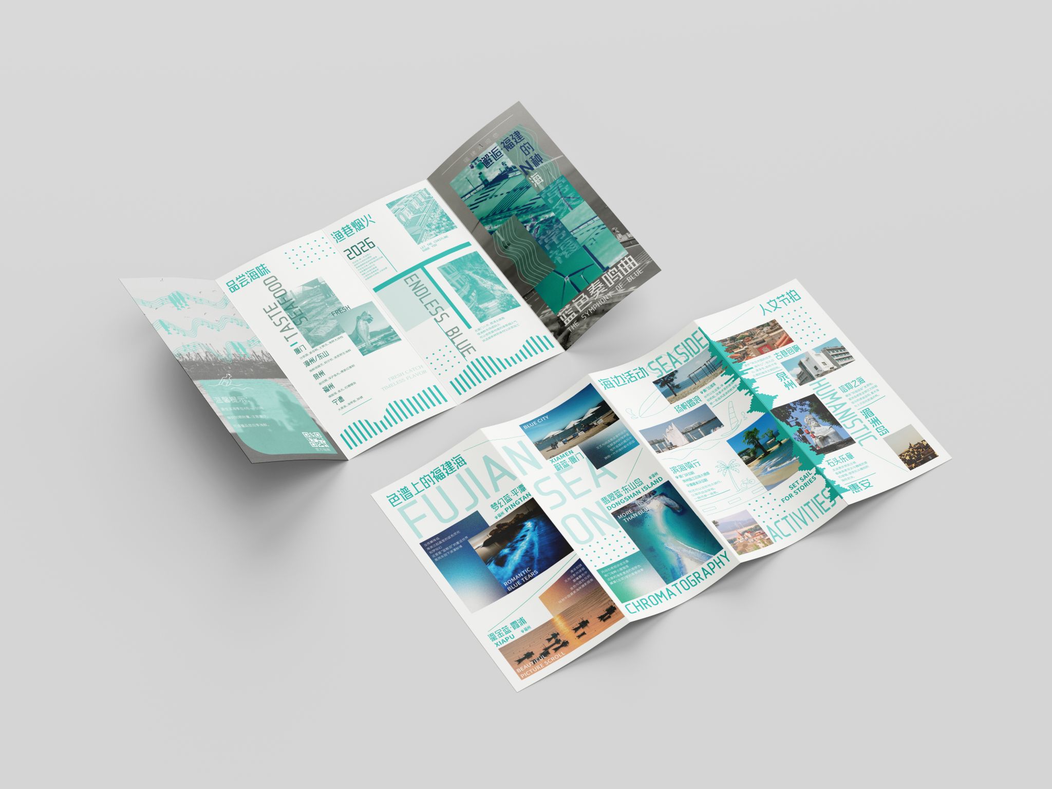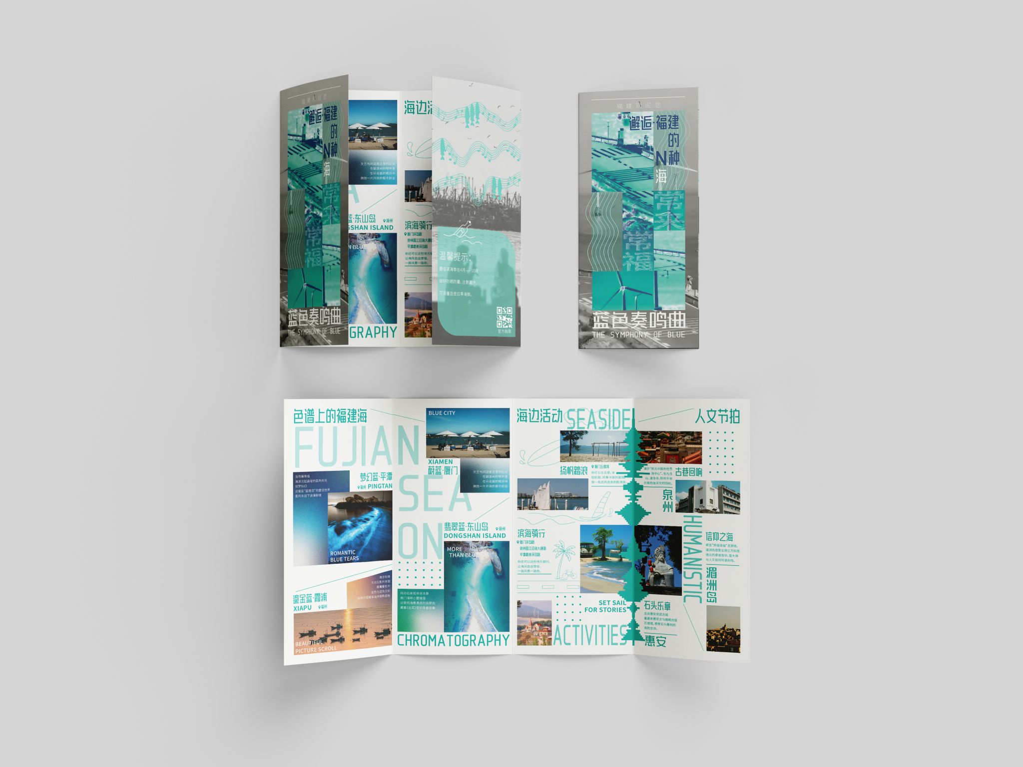 折页设计聚焦福建非遗文化推广和福建文旅形象宣传,在多重折叠中构建文化阅读动线,让历史脉络在层层展开中自然流淌。整合"全福游"品牌与在地特色,在山海交融的地理叙事与实用线路信息间寻找平衡。每一道折痕都是精心设计的停顿,每一次展开都是惊喜的 reveal。