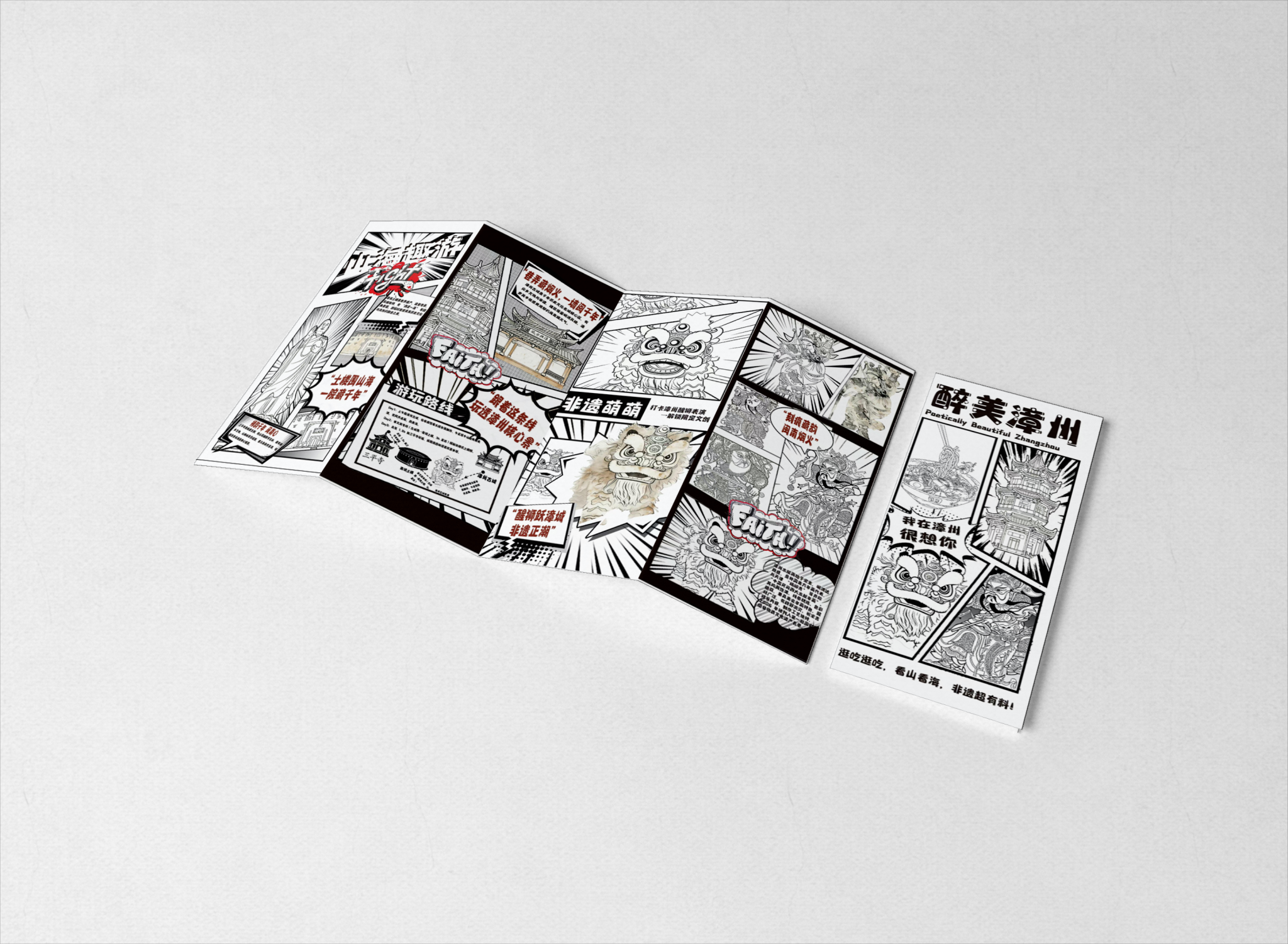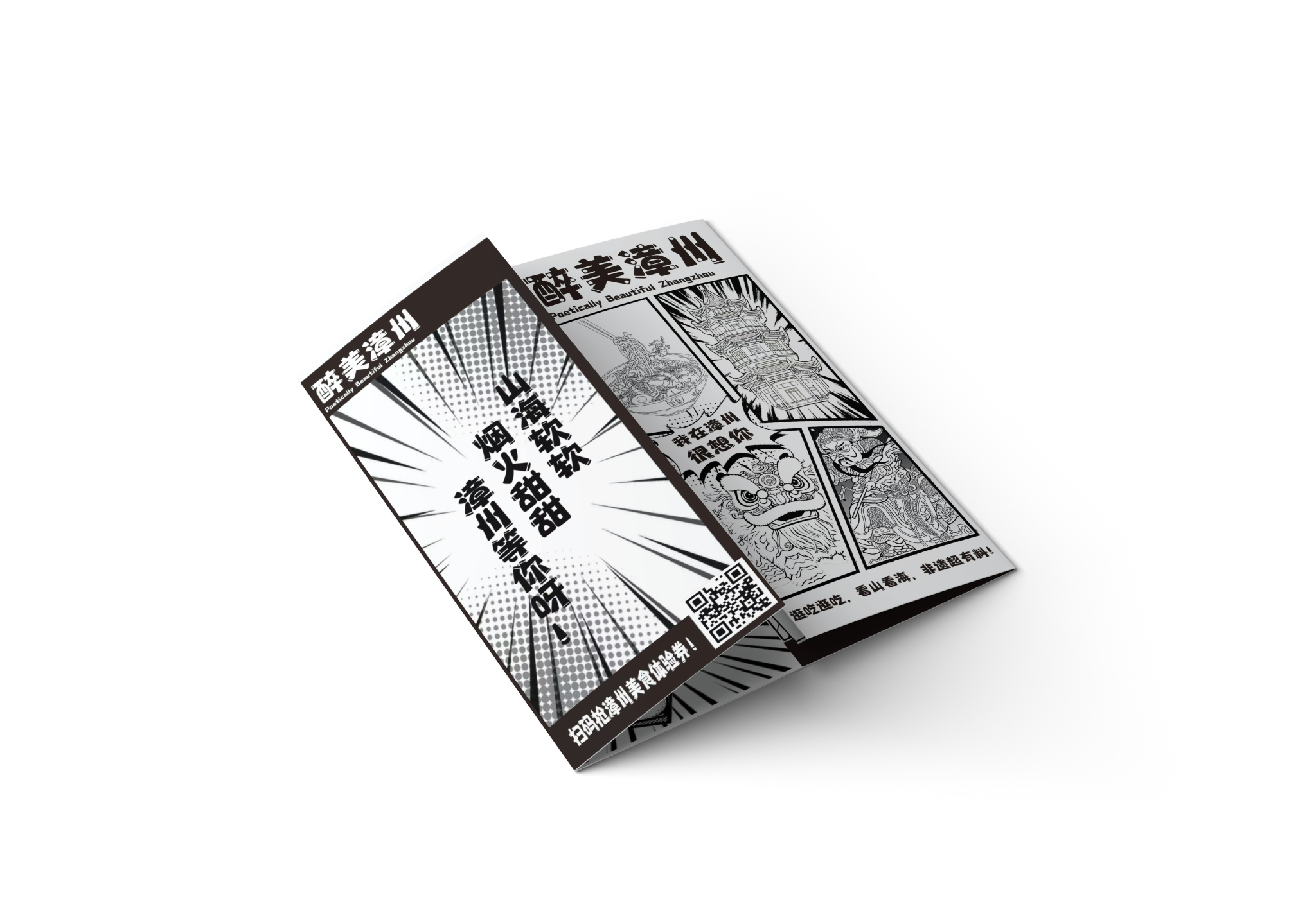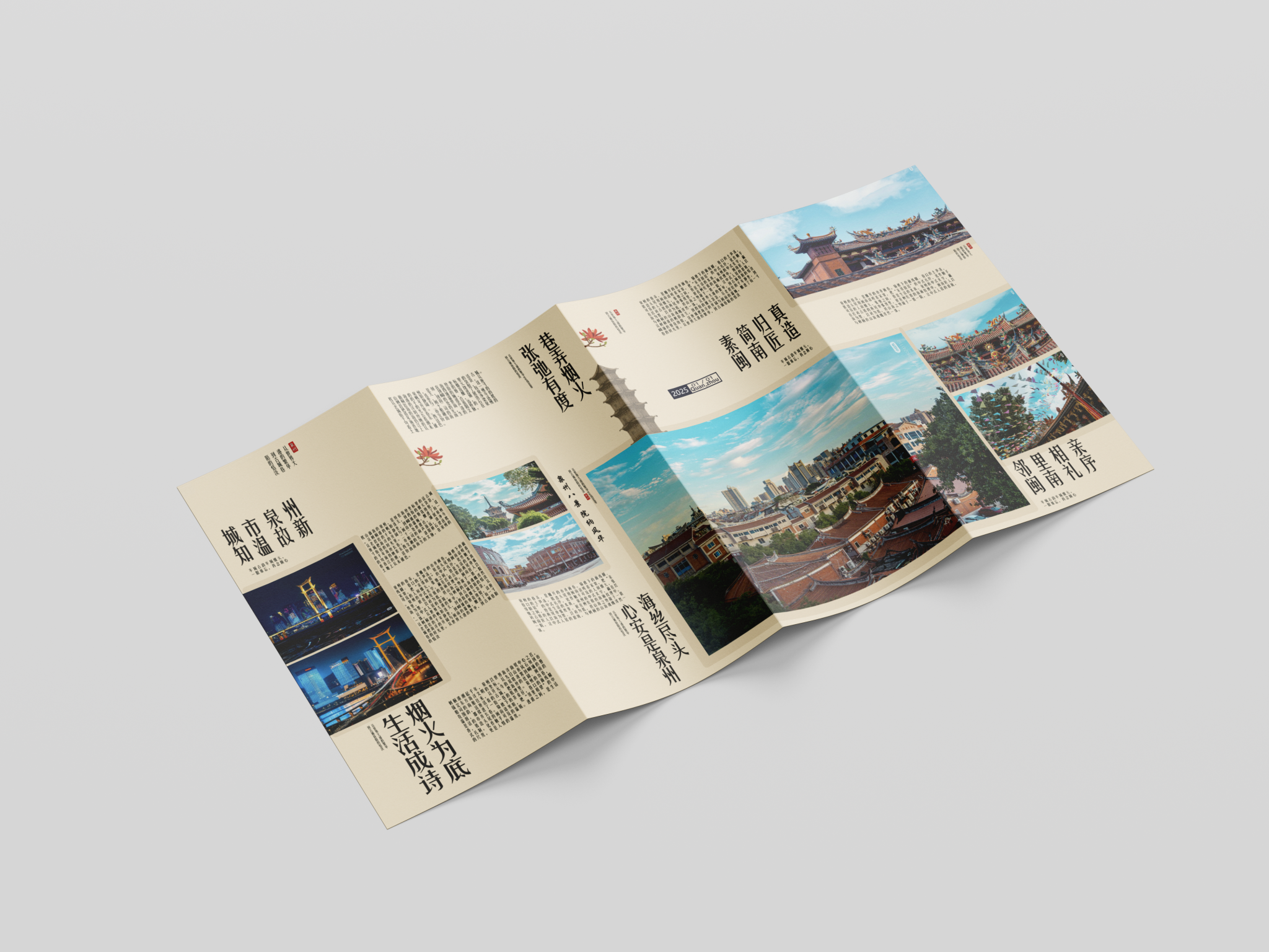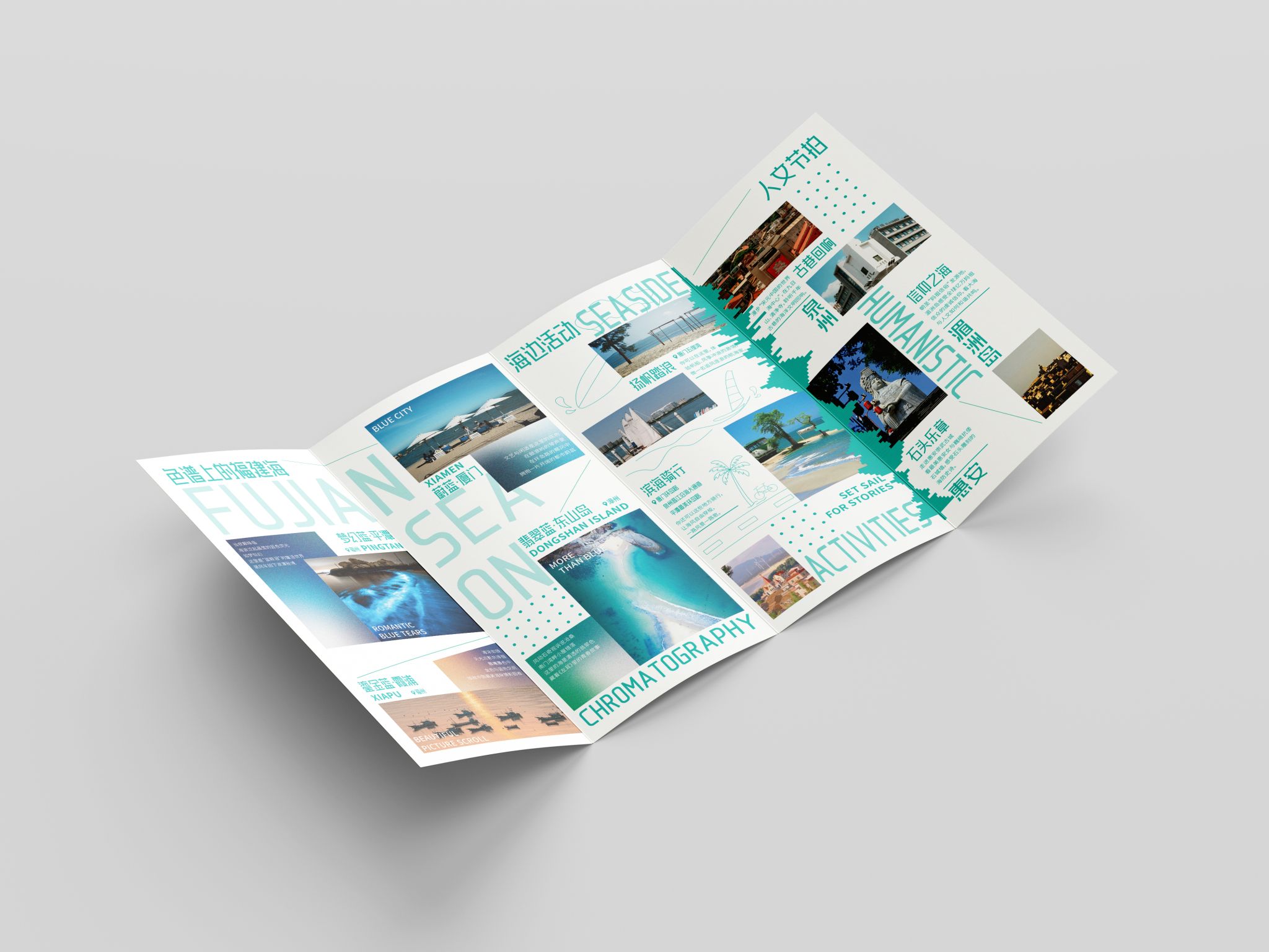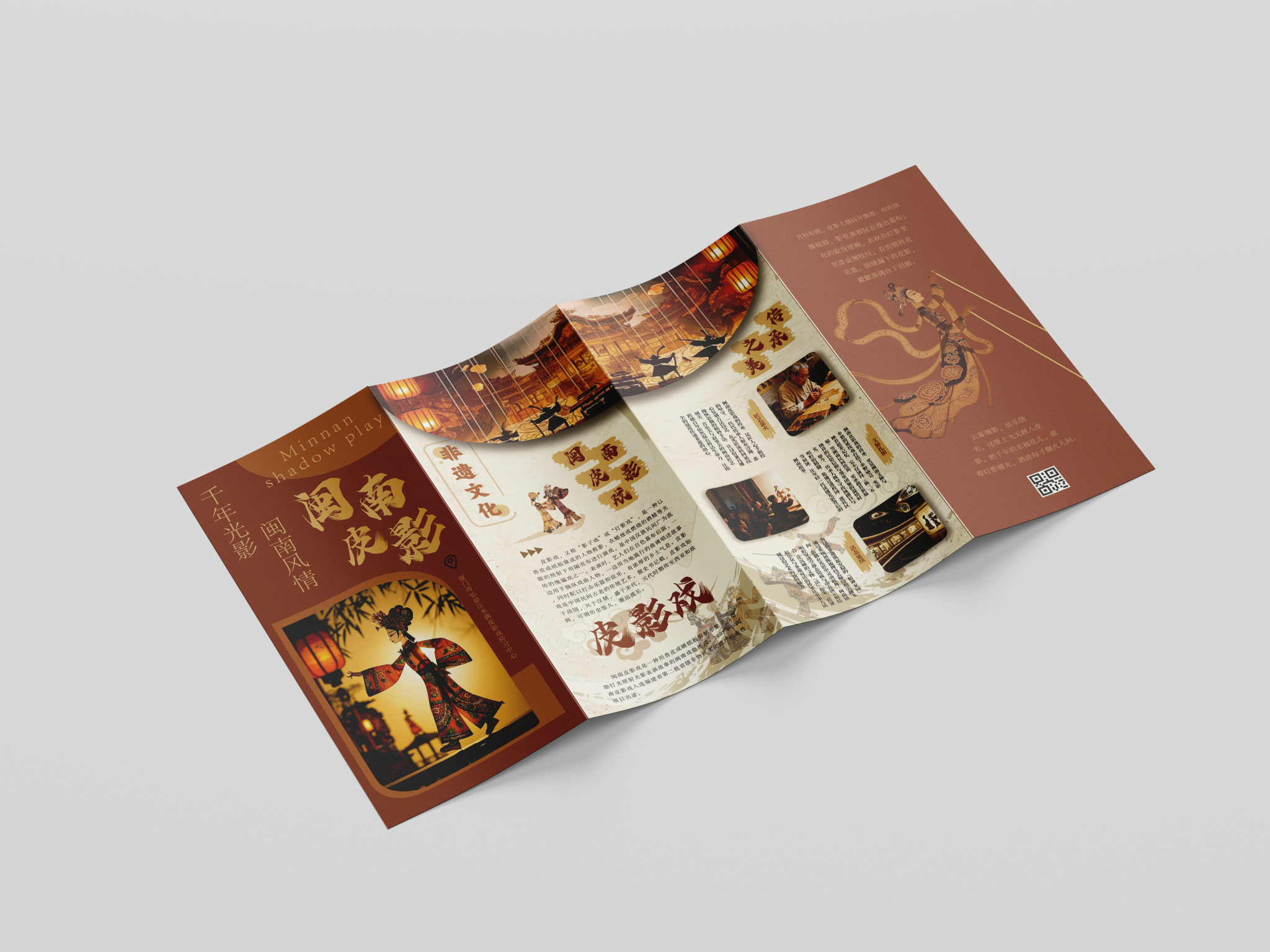 折页设计聚焦福建非遗文化推广和福建文旅形象宣传,在多重折叠中构建文化阅读动线,让历史脉络在层层展开中自然流淌。整合"全福游"品牌与在地特色,在山海交融的地理叙事与实用线路信息间寻找平衡。每一道折痕都是精心设计的停顿,每一次展开都是惊喜的 reveal。