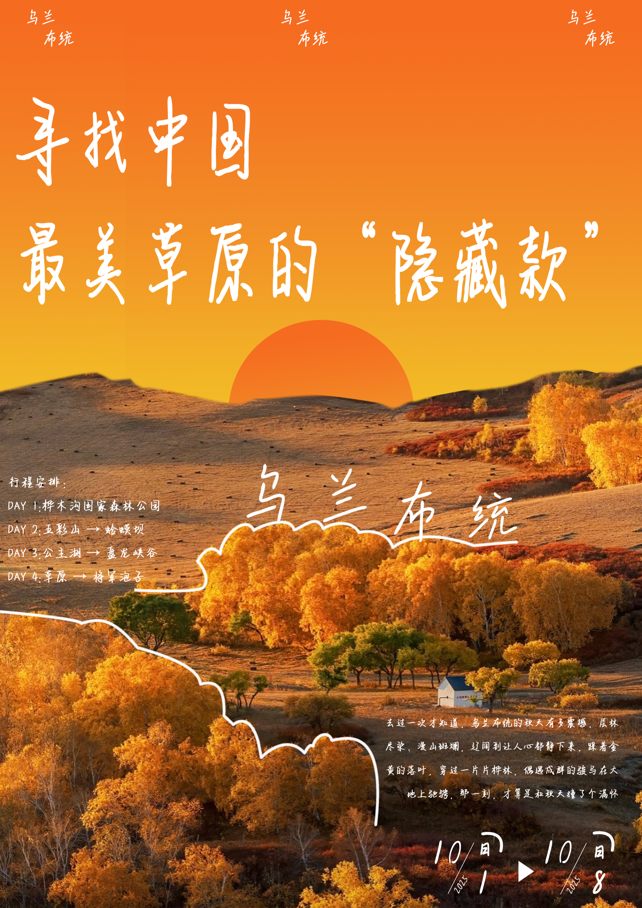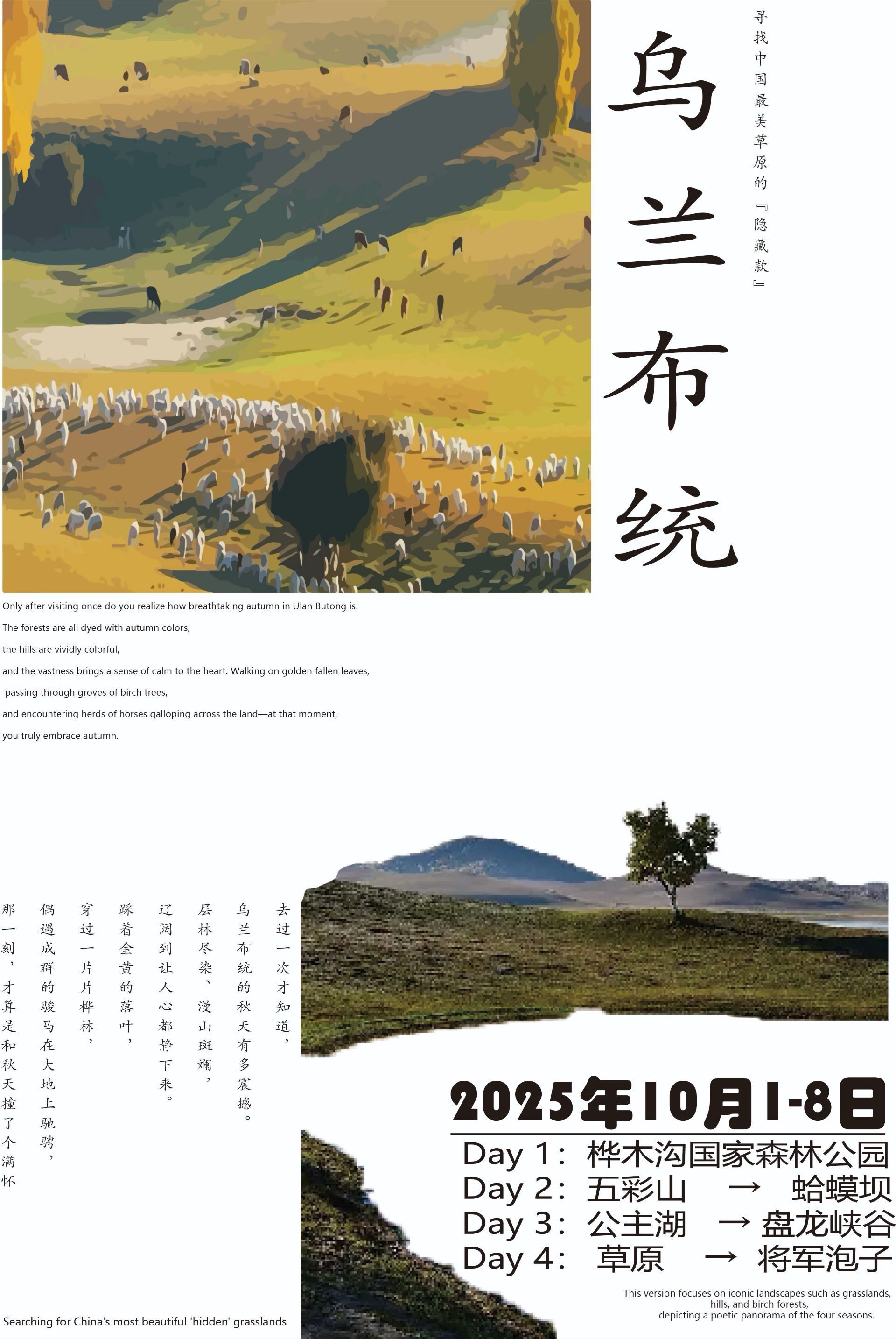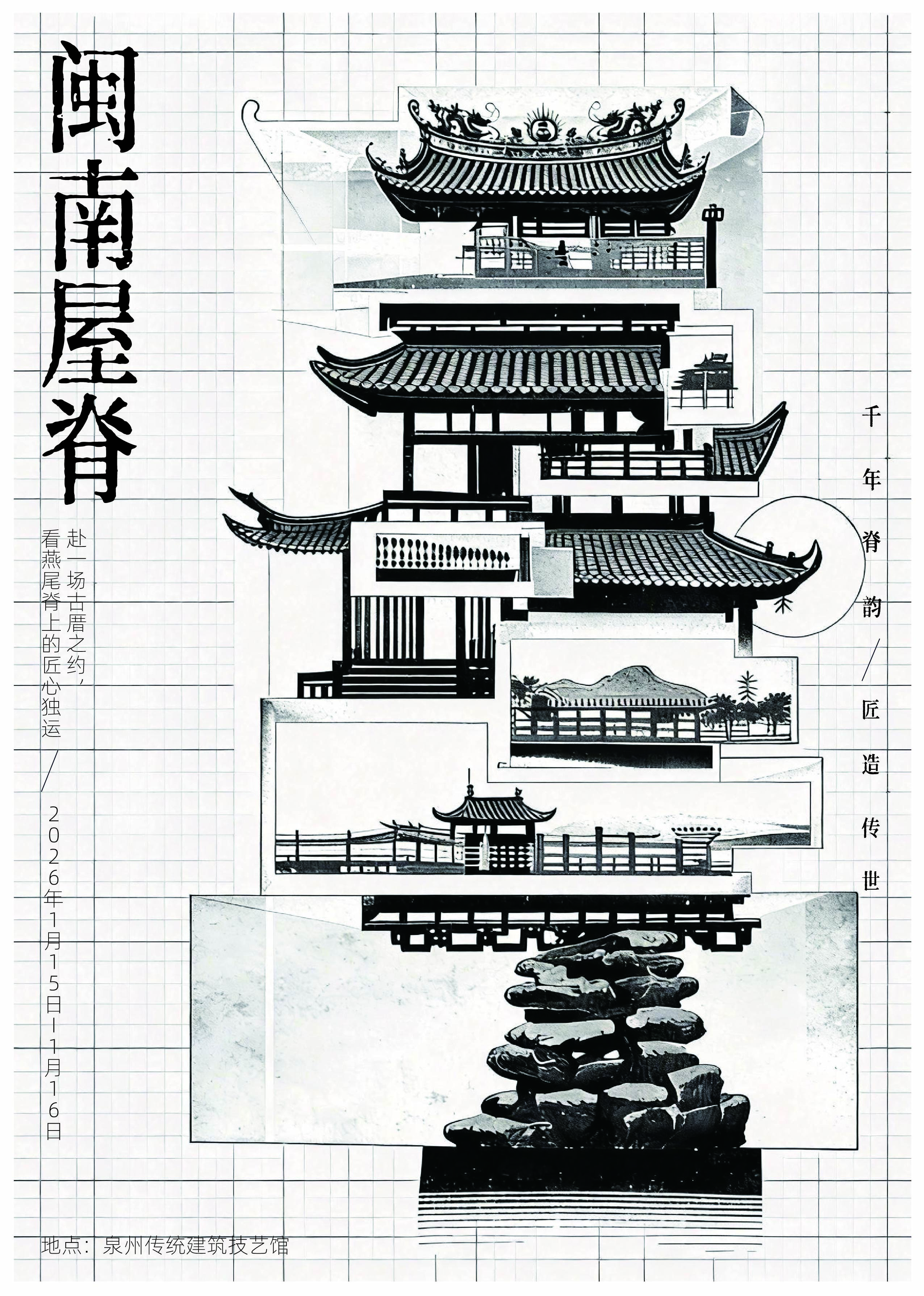 当文字遇见图像,当地域文化遇上现代设计语言。海报是版式设计中最具张力的表现形式,也是视觉冲击力与信息密度平衡的艺术。在本主题中,同学们以"远行"与"根脉"为双线索展开创作:旅行海报聚焦乌兰布统的辽阔草原与武夷山的丹霞茶韵,同学们用网格解构风景,让留白成为情绪的容器;文化海报则深耕福建本土,将闽南传统元素转化为当代文字设计。笔画间的呼吸、中西文的碰撞,让厚重的地域文化获得轻盈的视觉表达。