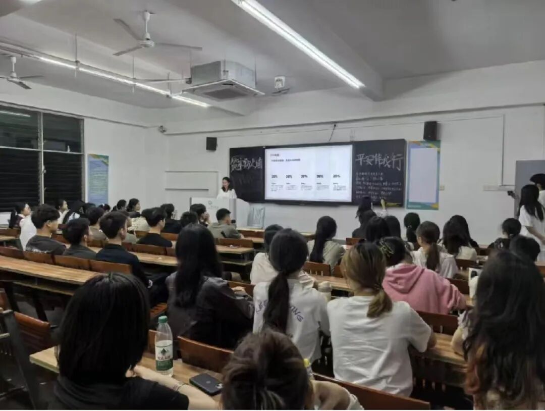班会从实际案例出发,通过PPT讲解高校宿舍用电、实验室管理等场景中可能存在的火灾隐患,结合真实火灾案例,帮助学生识别日常生活中的安全盲区。现场还播放了消防纪录片,演示灭火器正确使用方法,并模拟低姿逃生流程,将知识讲解与实操训练相结合。