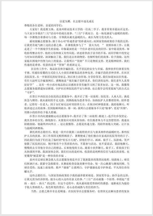 泉州职业技术大学学子熊玉珠分享“三行”志愿之旅,受国家资助投身多样服务,在助人中蜕变,传递微光与温暖。