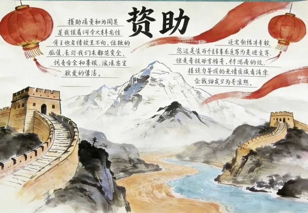 以长城、雪山绘家国盛景,借灯笼、红绸抒感恩之情,笔墨间诉说助学资助的温暖与力量,诠释受助者以心相报、以志践行的赤诚。