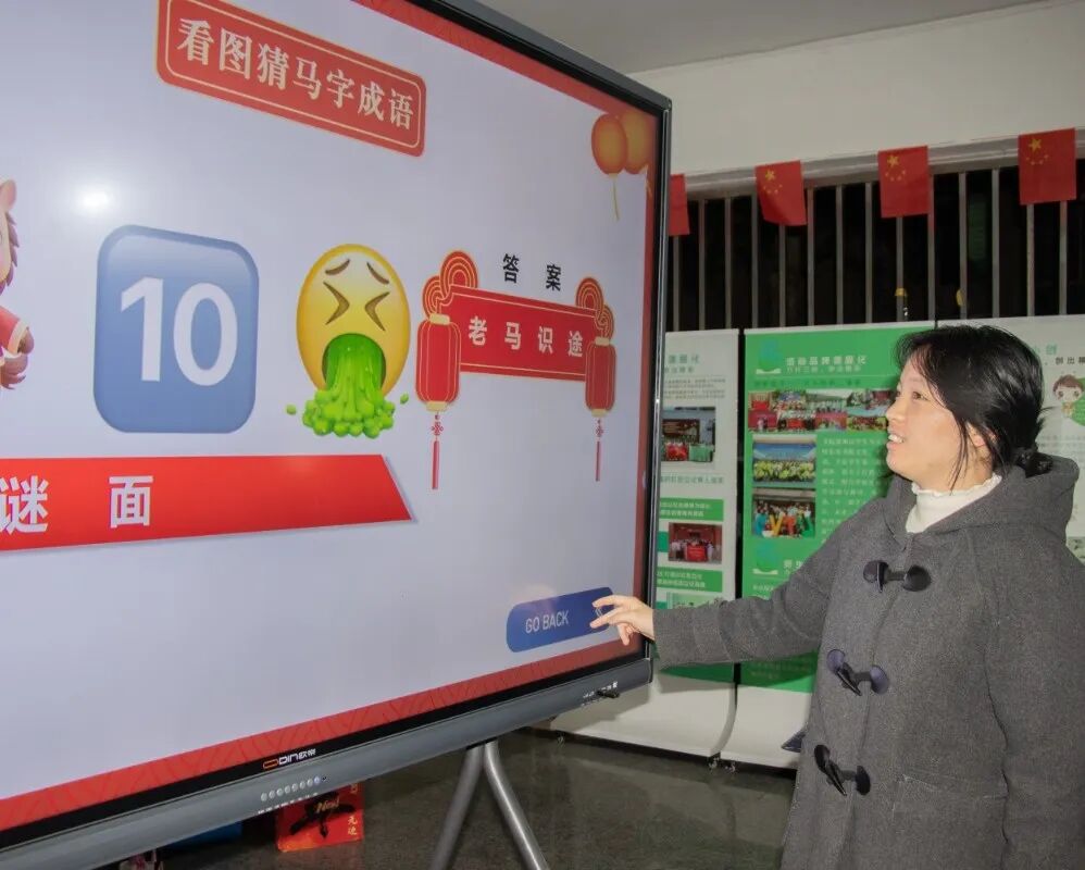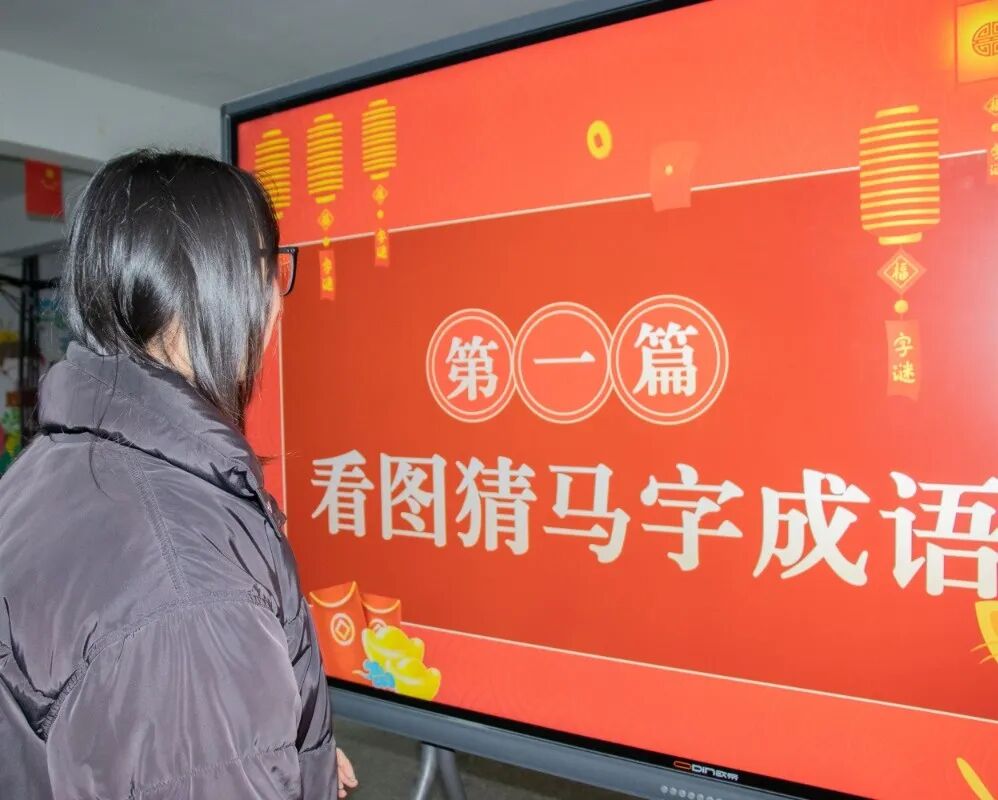 猜灯谜区域别有洞天——虽无花灯映月,却有光影传情。大屏幕用现代科技承载起古老的灯谜雅趣,从猜字谜到猜成语,题目丰富多变。同学们或凝神思索,或会心一笑,在光影变幻间品味汉字之美,传统民俗与青春活力在方寸屏幕间完美交融。