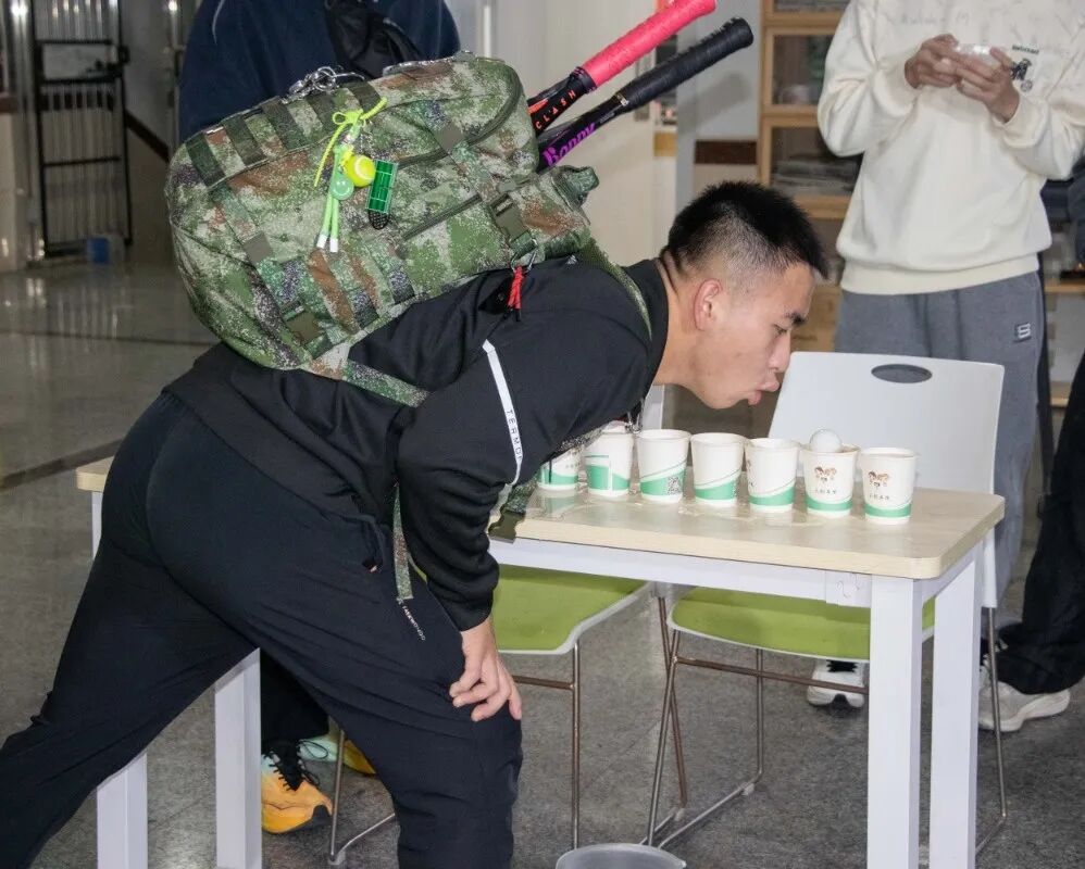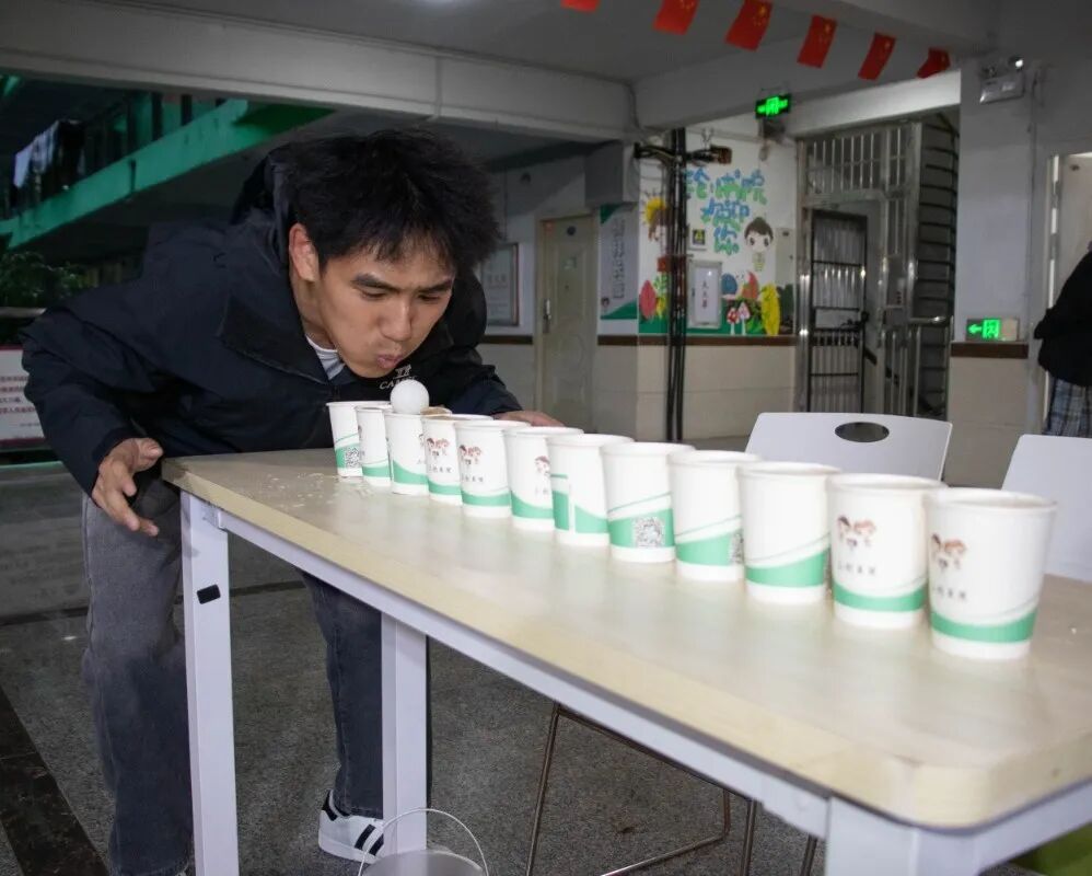 吹“元宵”区域里,同学们屏息凝神,轻轻吹动杯中的小球。乒乓球化作一颗颗圆润的“元宵”,在水波间缓缓前行。每一次稳稳抵达终点,都迎来阵阵喝彩,成功闯关的喜悦在眉眼间荡漾开来。