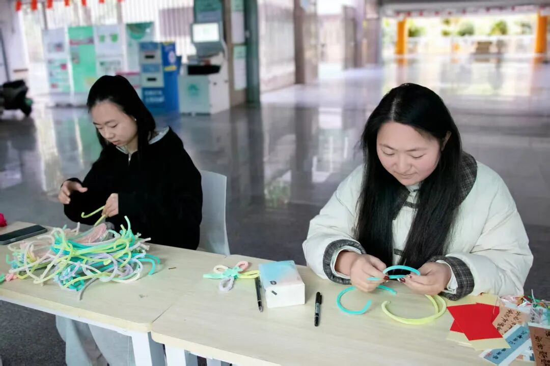 与此同时,扭扭棒 DIY 区域同样热闹非凡,创意涌动。同学们充分发挥想象力与创造力,手持五颜六色的扭扭棒,指尖翻飞、巧妙弯折,一朵朵灵动的花朵、一个个可爱的小摆件相继诞生。大家专注创作,亲手打造独一无二的专属礼物,或赠予身边重要的女性亲友,或留作自己的节日纪念,让这份节日的祝福多了一份专属的心意与温度。