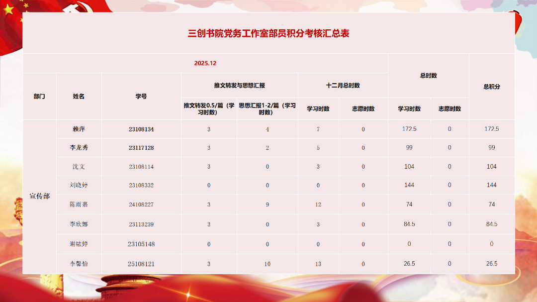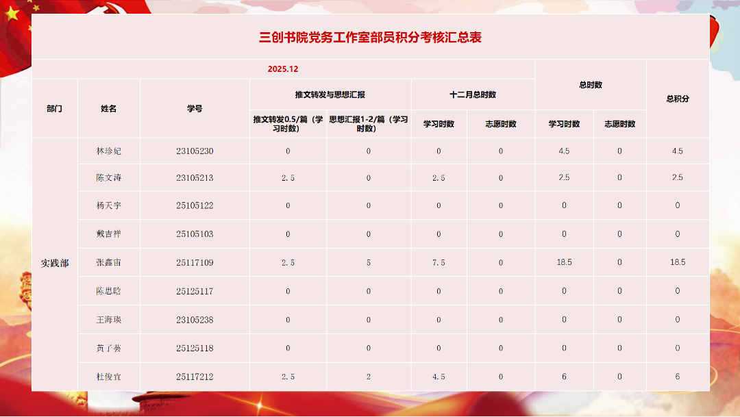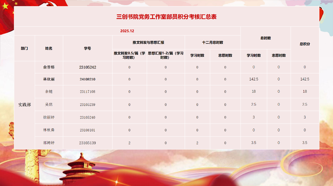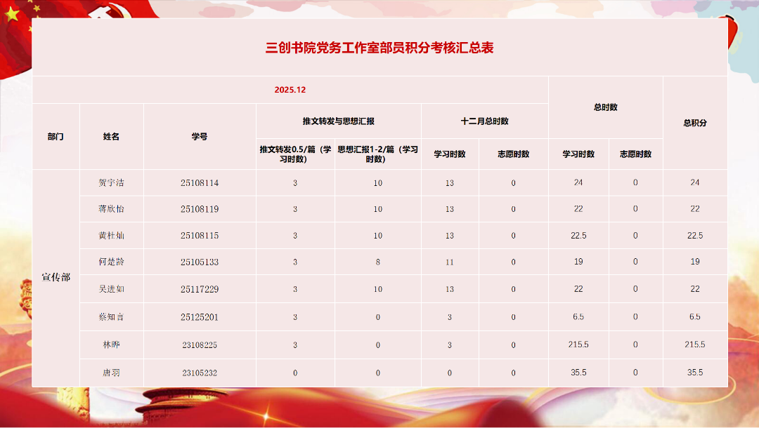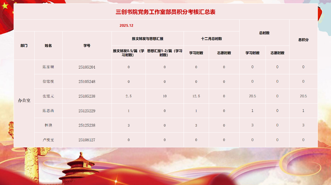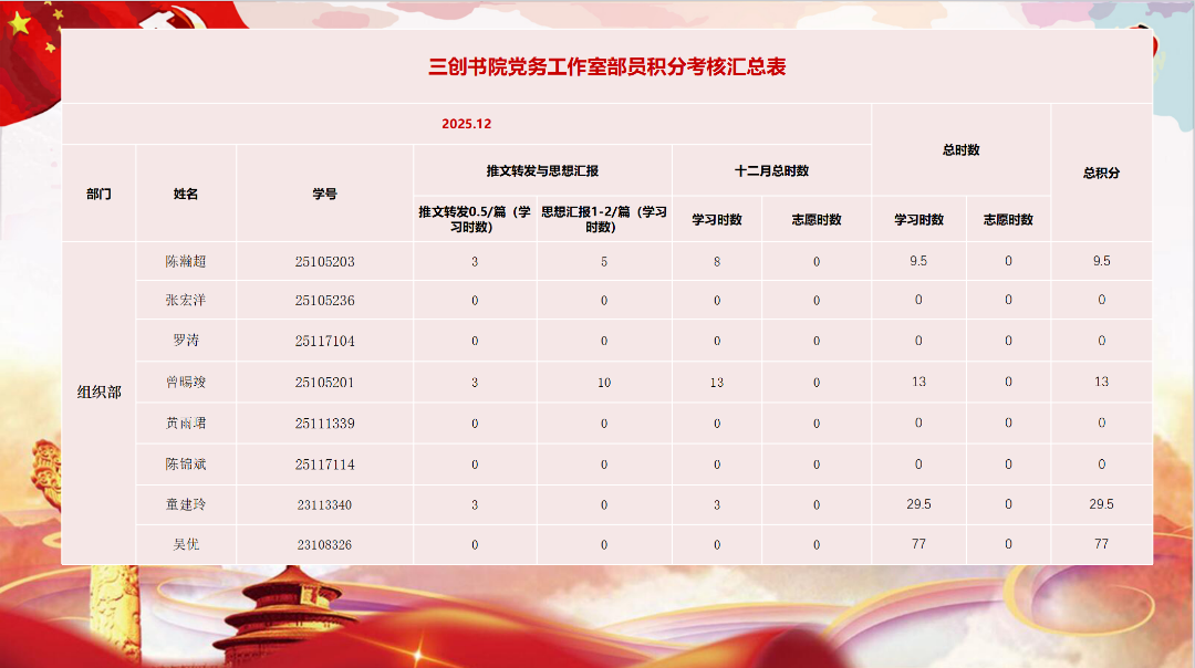 三创书院37、38、39、40期入党积极分子及党务工作室成员在十二月份转发推文数量共计397篇,心得160篇。