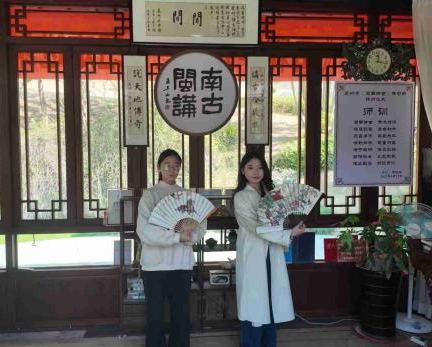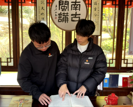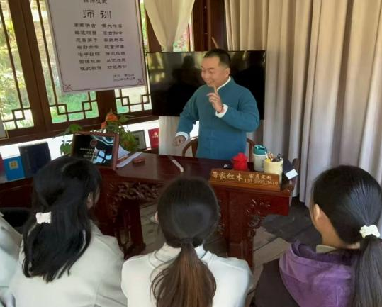 李文星师父亲自带领社会实践团的大学生们,细细翻阅记载泉州讲古渊源的典籍,还详尽讲解了讲古必备的折扇与惊堂木的门道。现场教学时,他耐心指导女生们拿捏折扇的淑女姿态,从持扇的轻重、开合的幅度,再到眼神流转的柔和度,手把手拆解每一个要领;又逐字逐句教男生们用纯正闽南语念诵经典开场白——“讲古今故事,说天地传奇”,一遍遍纠正发音、调整语调。实践团成员们轮番模仿不同性别、身份的讲古姿态,潜心钻研演绎技巧,在沉浸式体验中,深深领略到了闽南讲古的独特魅力。