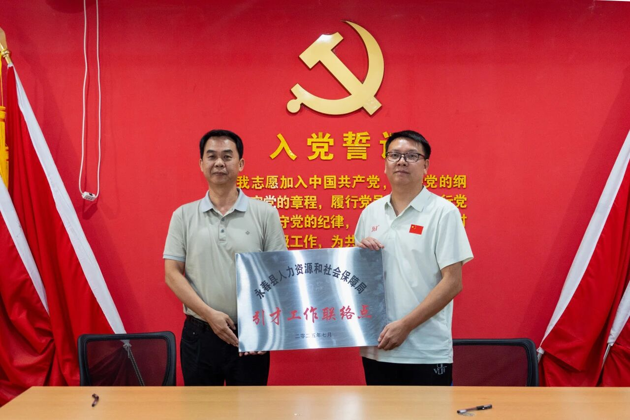 ▲ 永春县人社局副局长林华毅和泉州职业技术大学副校长林文艺共同签订引才共育共建协议,随后林华毅为泉州职业技术大学授予“引才工作联络点”牌匾