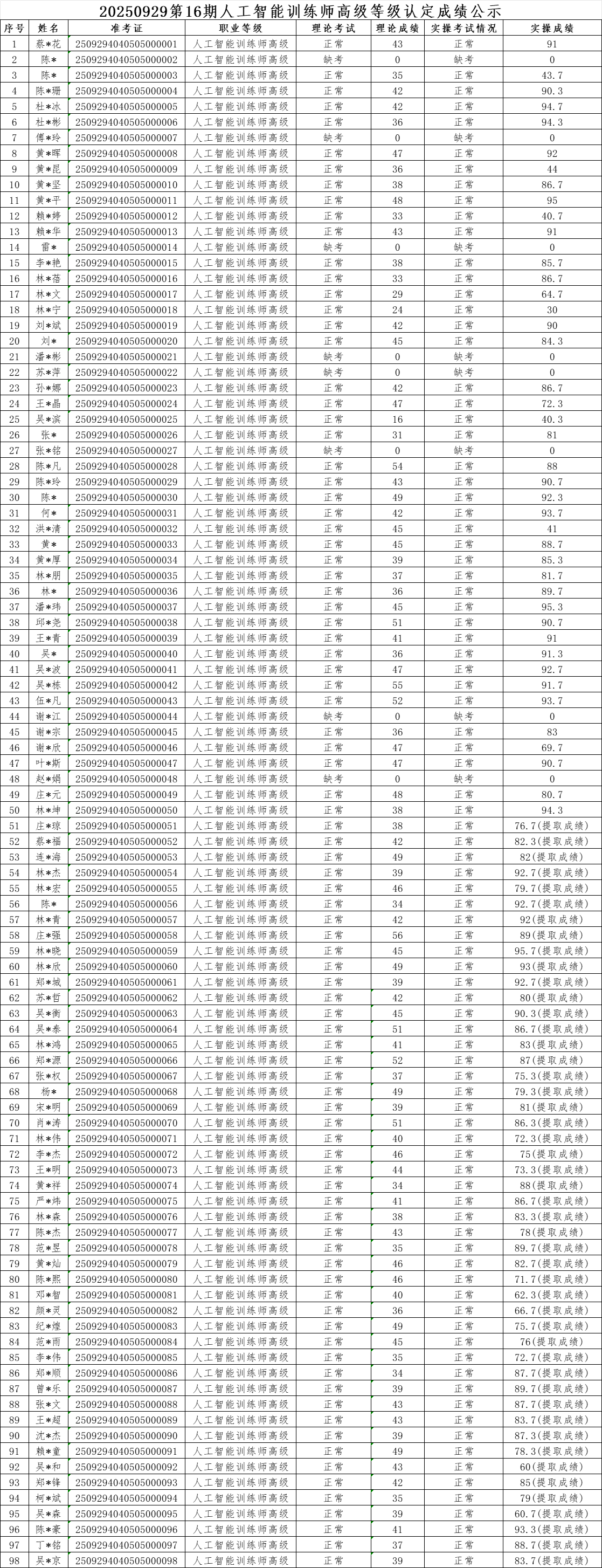 20250929第16期人工智能训练师高级等级认定成绩公示