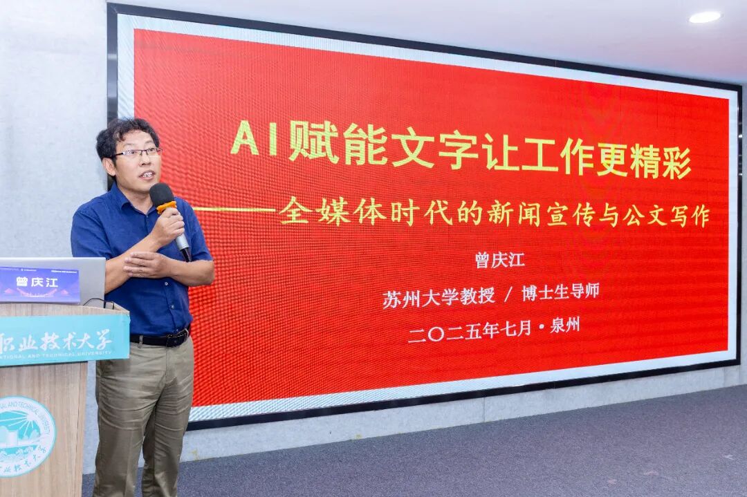课程上,研修班邀请了中国新闻奖获得者、科技日报社地方记者部副主任滕继濮,常州机电职业技术学院党委委员、宣传部部长毛加明,江南大学党委常委、副校长倪松涛,常州纺织服装职业技术学院数字媒体技术专业带头人唐爱平副教授,苏州大学传媒学院博士生导师、新闻系主任曾庆江教授分别带来“科技新闻采写特质”“高校舆情易发点与应对”“意识形态宣传的若干问题”“短视频制作与传播”“AI赋能文字让工作更精彩”等高品质的新闻宣传课程。