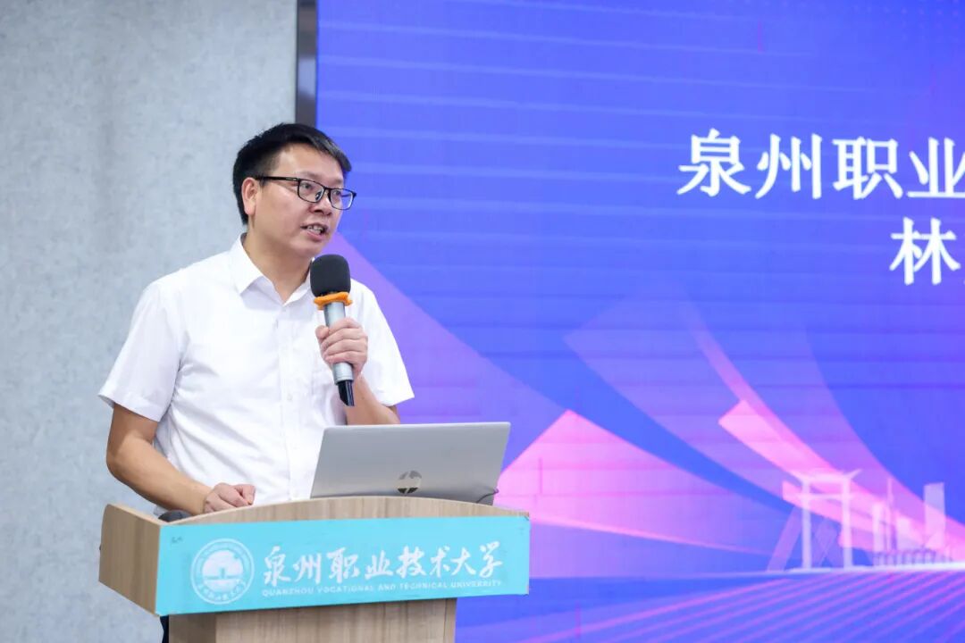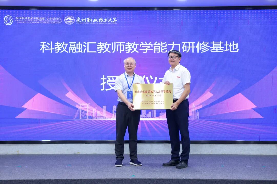 ▲ 泉州职业技术大学被授予“科教融汇教师教学能力研修基地”,现代职业教育科教融汇专委会主任单位代表、常州纺织服装职业技术学院党委书记吴访升向副校长林文艺授牌