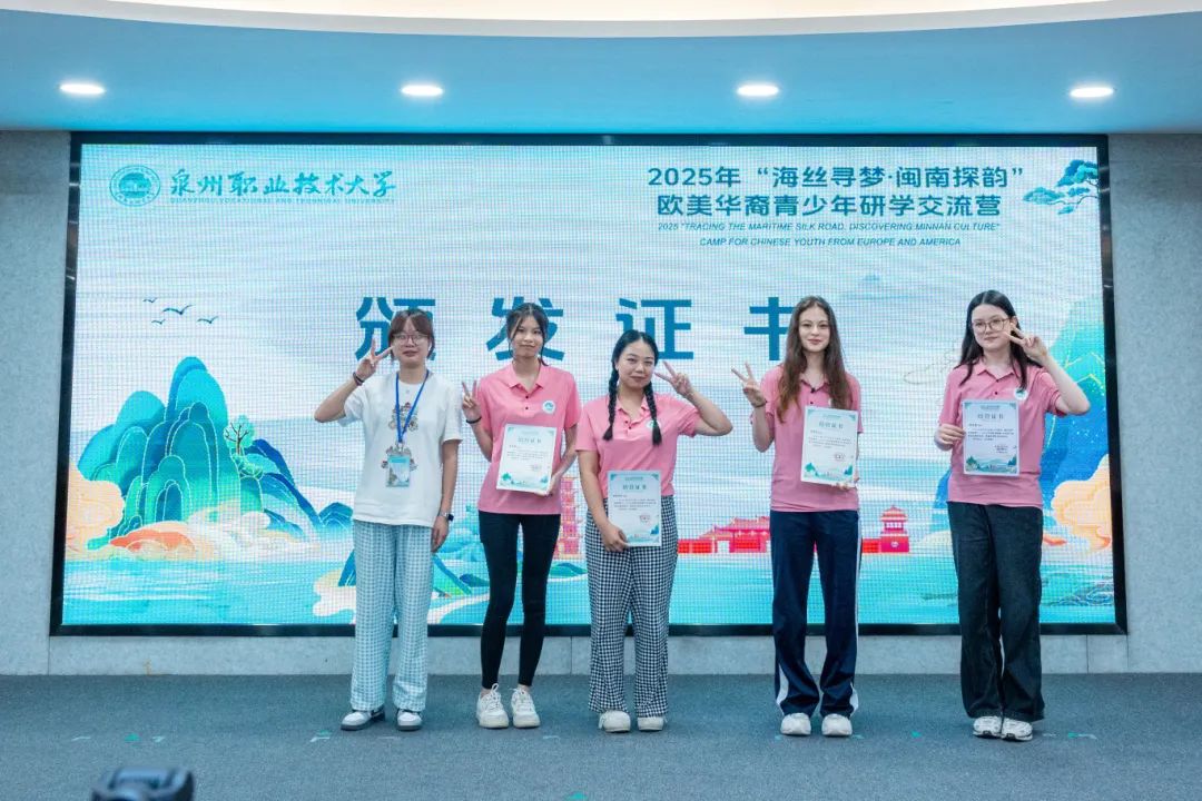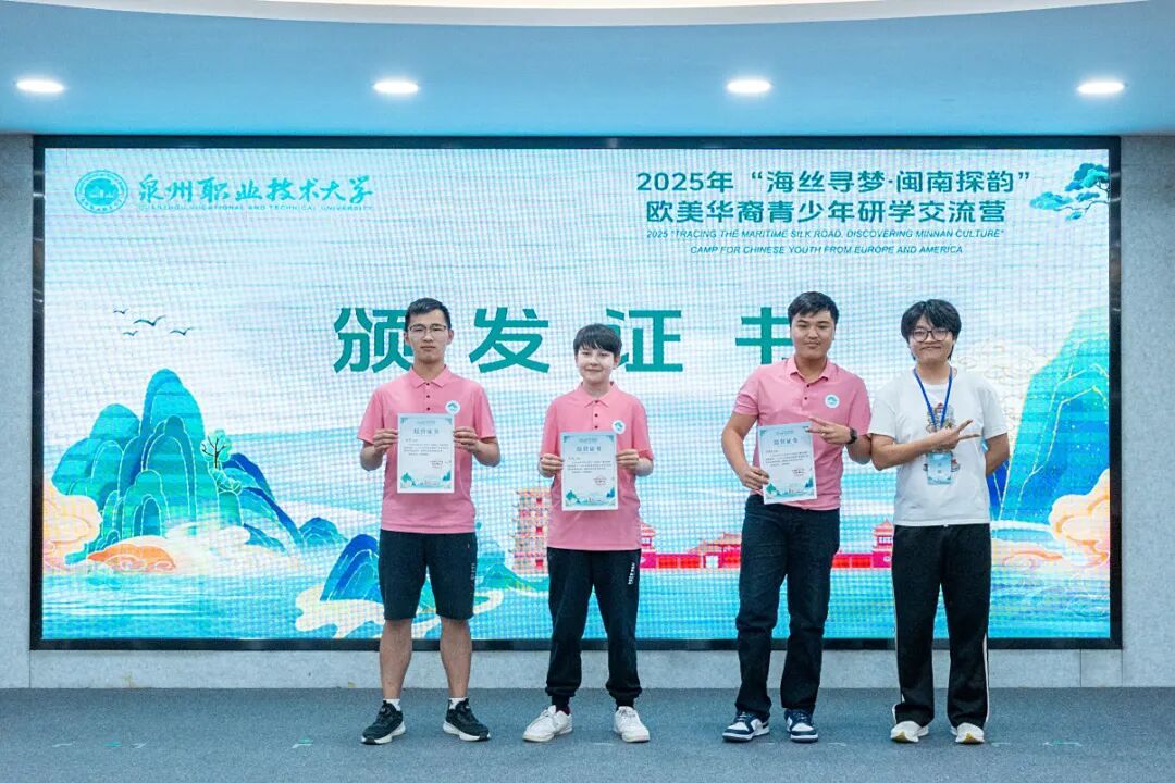 收官日,闭营仪式暨联欢晚会成为情感的高光时刻。助教团队制作的十日点滴视频暖场,帧帧画面唤起共同记忆;助教与营员面对面唱响《再见》,离别成温柔的叮咛;证书颁发环节,每组助教亲手将结业证书递到营员手中,简单的动作藏着朝夕相处的默契与不舍;领队胡鑫老师代表德国汉华中文学校向泉州职业技术大学赠旗致谢,双向的温暖在仪式中流淌。