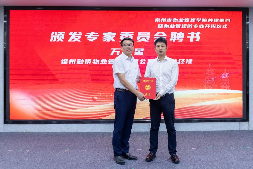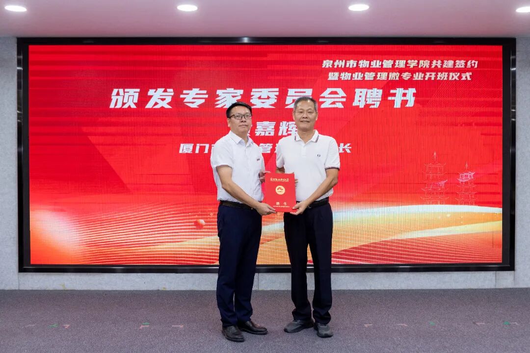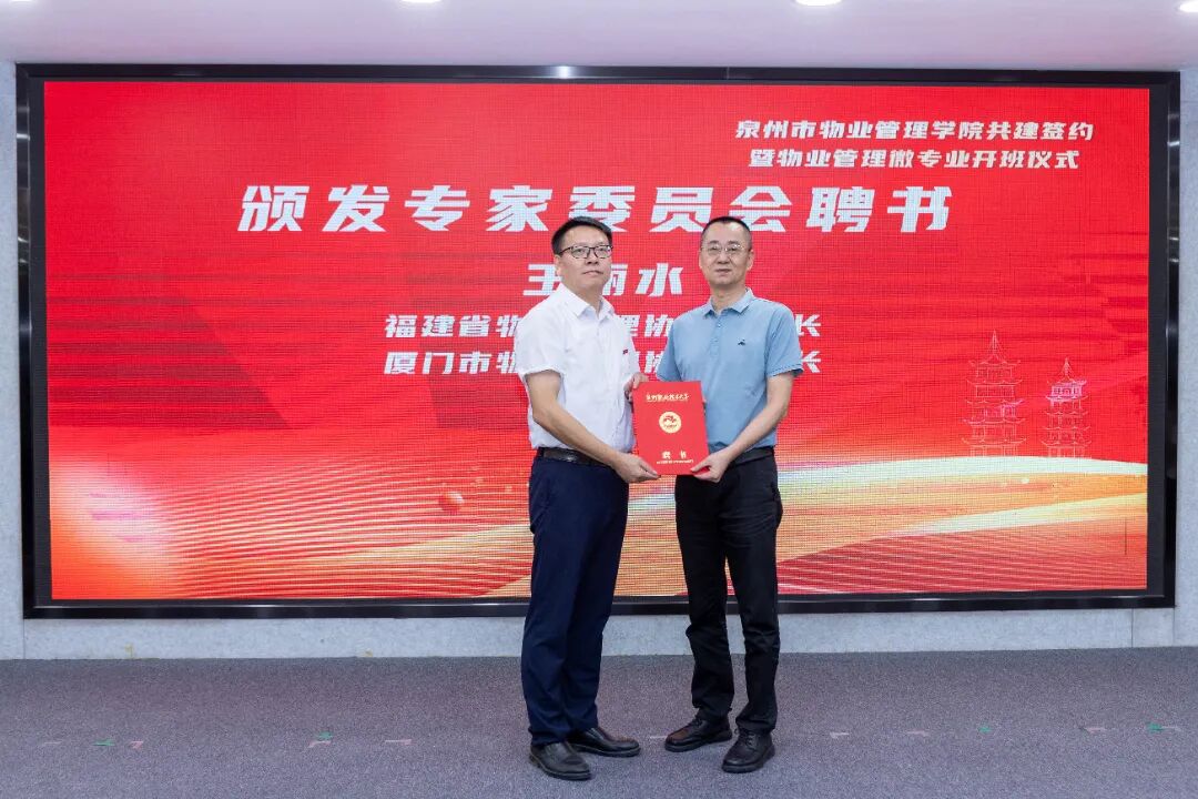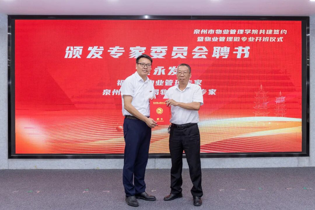泉州职业技术大学副校长林文艺为首批专家委员会成员颁发聘书,他们分别是中国物业管理协会产学研专业委员会副主任兼秘书长廖月华,西安欧亚学院物业研究院副院长薛雯、厦门市物业管理协会会长黄嘉辉,福建省物业管理协会副会长、厦门市物业管理协会副会长王丽水,泉州市物业管理协会会长郭志铭,晋江市物业管理协会会长黄志强,泉州市洛江区物业管理行业协会会长庄曦,福建省物业管理专家、泉州市住建局物业管理专家黄永发,骏源(福建)生活服务发展有限公司董事长林振彬,福建省长冠物业管理有限公司董事长庄能辉,福州融侨物业管理有限公司执行总经理万星星,福建省晋江市建设投资控股集团有限公司副总经理、福建省晋江新佳园控股有限公司董事长、晋江市新佳园物业发展有限公司董事长李德毅。