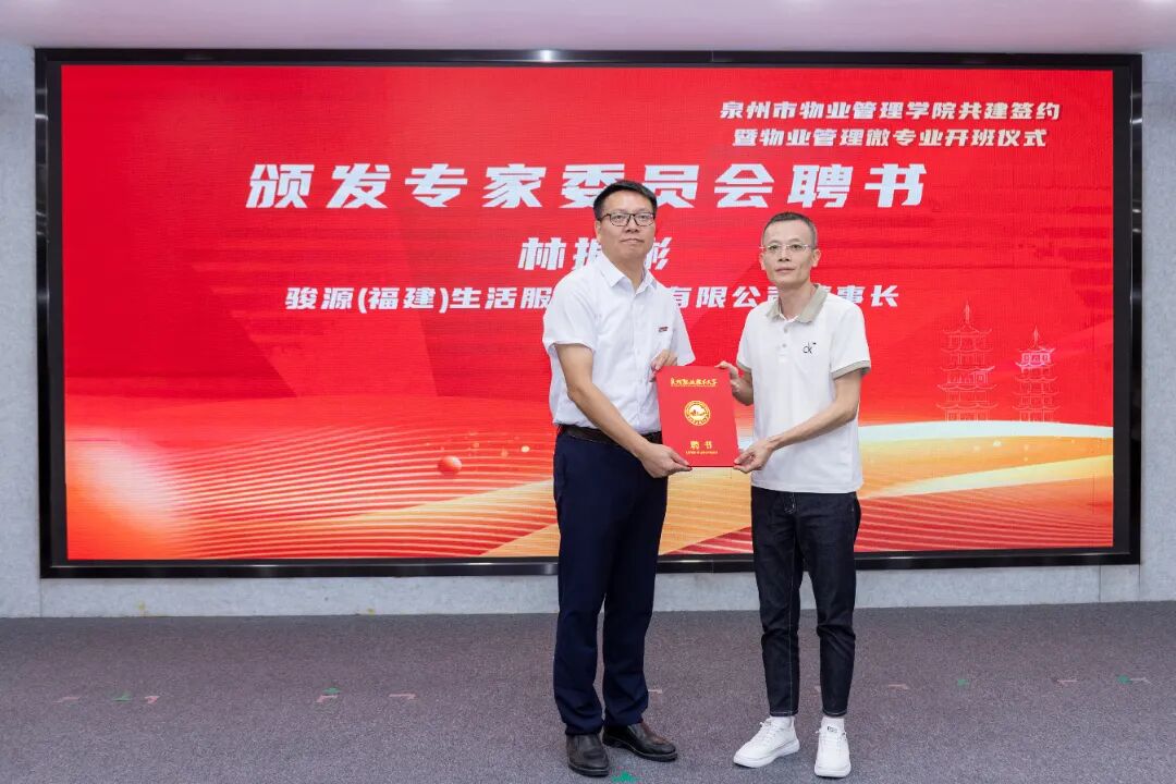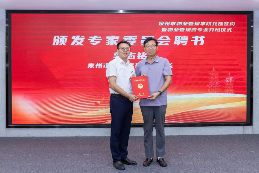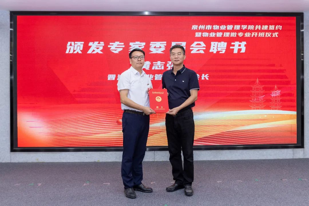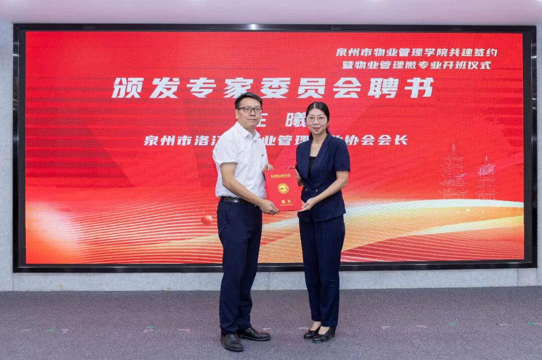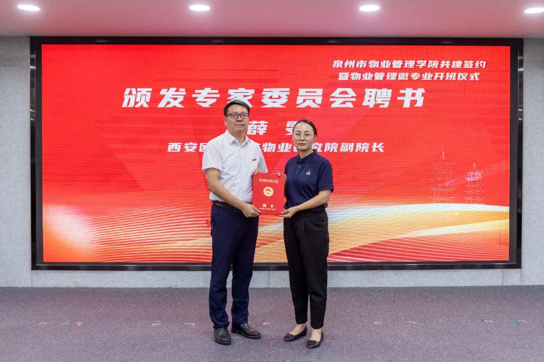泉州职业技术大学副校长林文艺为首批专家委员会成员颁发聘书,他们分别是中国物业管理协会产学研专业委员会副主任兼秘书长廖月华,西安欧亚学院物业研究院副院长薛雯、厦门市物业管理协会会长黄嘉辉,福建省物业管理协会副会长、厦门市物业管理协会副会长王丽水,泉州市物业管理协会会长郭志铭,晋江市物业管理协会会长黄志强,泉州市洛江区物业管理行业协会会长庄曦,福建省物业管理专家、泉州市住建局物业管理专家黄永发,骏源(福建)生活服务发展有限公司董事长林振彬,福建省长冠物业管理有限公司董事长庄能辉,福州融侨物业管理有限公司执行总经理万星星,福建省晋江市建设投资控股集团有限公司副总经理、福建省晋江新佳园控股有限公司董事长、晋江市新佳园物业发展有限公司董事长李德毅。
