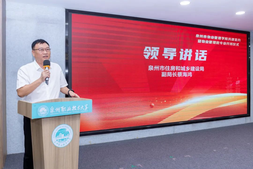 蔡海鸿强调,在现代城市治理体系中,物业管理已经从简单的“维修看门”服务,升级为基层社会治理的核心纽带和民生福祉的关键支撑。当前,住建部已将“好物业”纳入“好房子”建设的重要一环,并在全国范围内开展物业管理提升专项行动,省住建厅及市委、市政府已将社区物业管理提升作为中心工作,致力于破解物业行业发展及人才困境。在这样的背景下,泉州市物业管理学院应运而生。学院的成立,是泉州市物业管理行业发展的一个重要里程碑。蔡海鸿要求:一是希望学院能致力于破解物业人才困境。学院需以培养 “懂治理、善群众工作” 的复合型人才为目标,破解人才困境。二是希望企业通过实践与就业“双保障”留住人才。企业应加强与学院合作,通过 “师带徒”“预备经理人计划” 等,实现实践与就业双保障留住人才。三是希望首批参训学员能够把握开启人生的另一种可能。首批学员要把握机遇,在智慧、绿色、人文物业等新领域学习探索,助力行业发展。