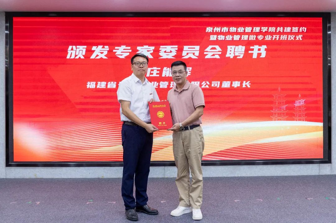 泉州市物业管理协会会长郭志铭、泉州职业技术大学人居环境学院执行院长吴铭辉签署行业人才培养协议。