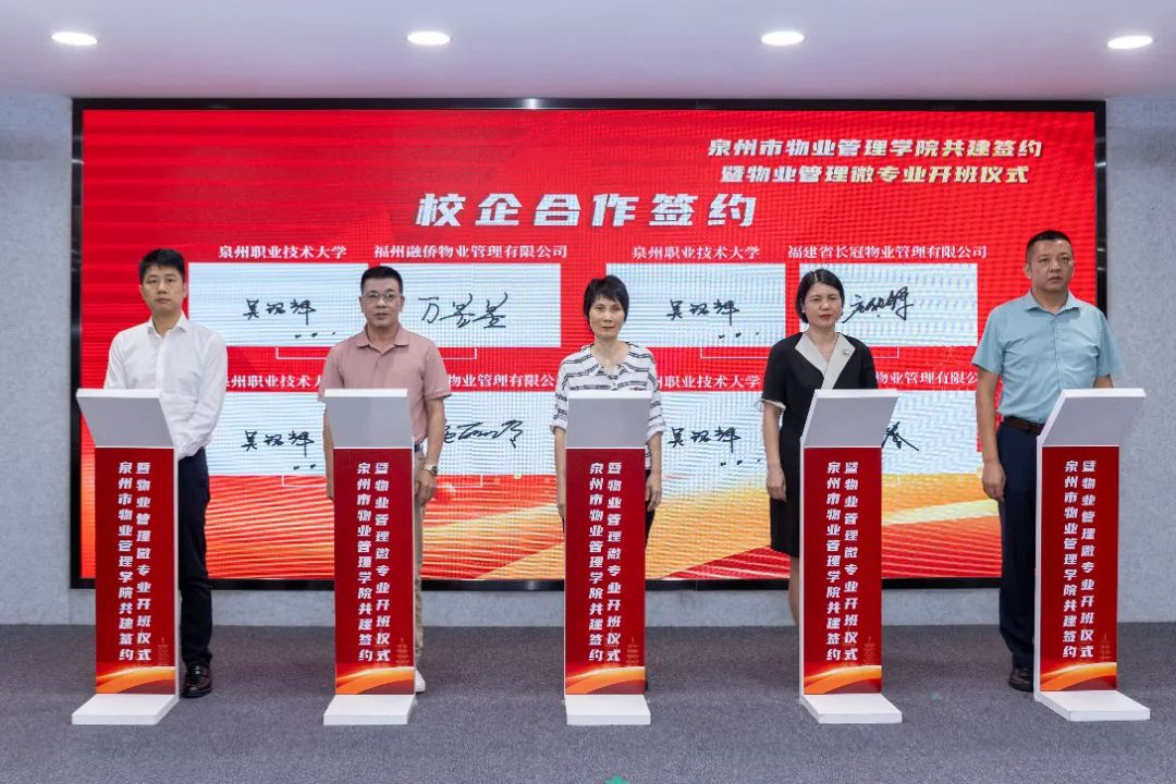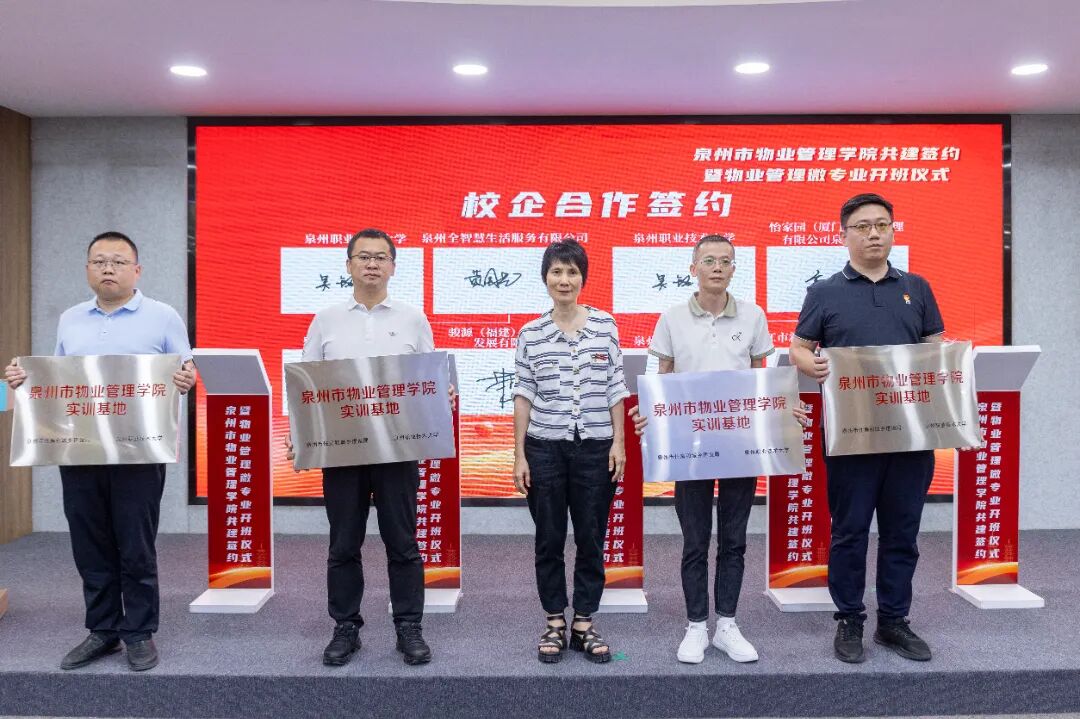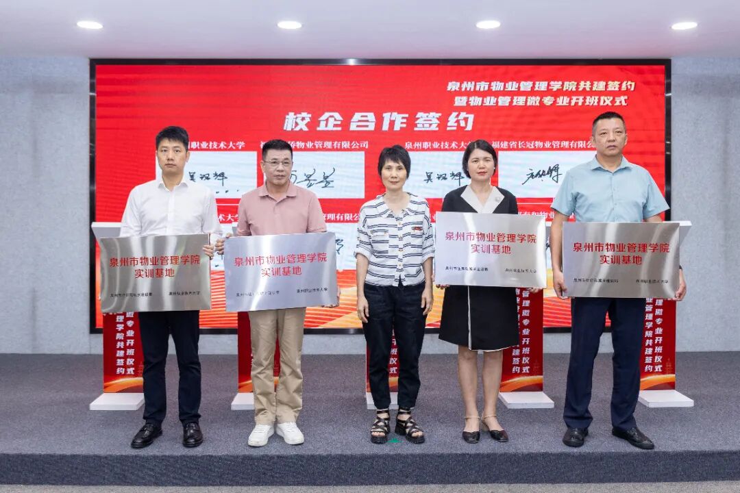 泉州职业技术大学人居环境学院执行院长吴铭辉与首批8家实训基地企业签约并授牌。8家实训基地企业分别为,福州融侨物业管理有限公司、福建省长冠物业管理有限公司、福建南方物业管理有限公司、福建世邦泰和物业管理有限公司、泉州全智慧生活服务有限公司、怡家园(厦门)物业管理有限公司泉州分公司、骏源(福建)生活服务发展有限公司、晋江市新佳园物业发展有限公司。