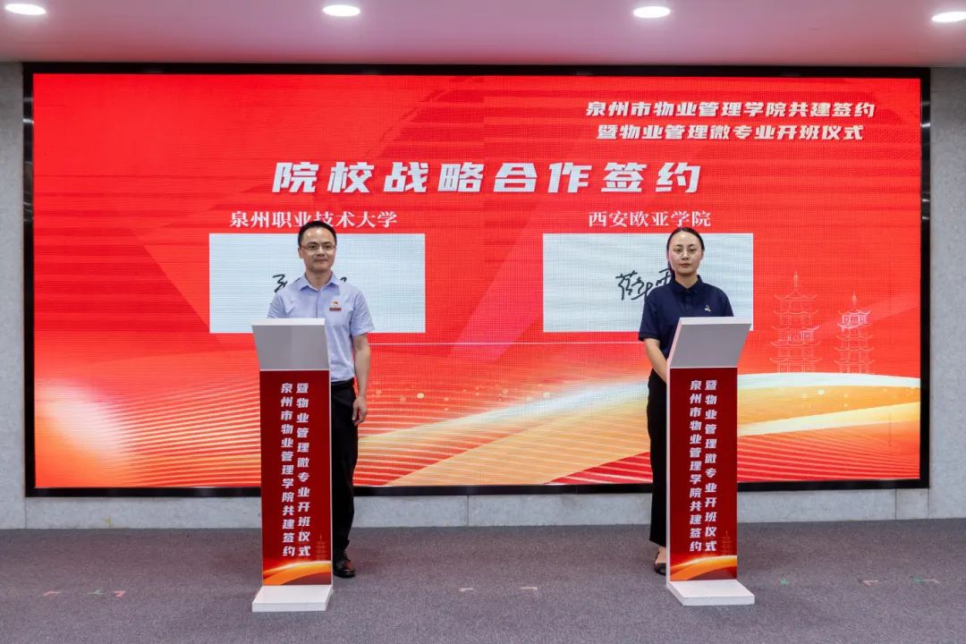 西安欧亚学院物业研究院副院长薛雯与泉州职业技术大学人居环境学院书记张艺能签署战略合作协议。
