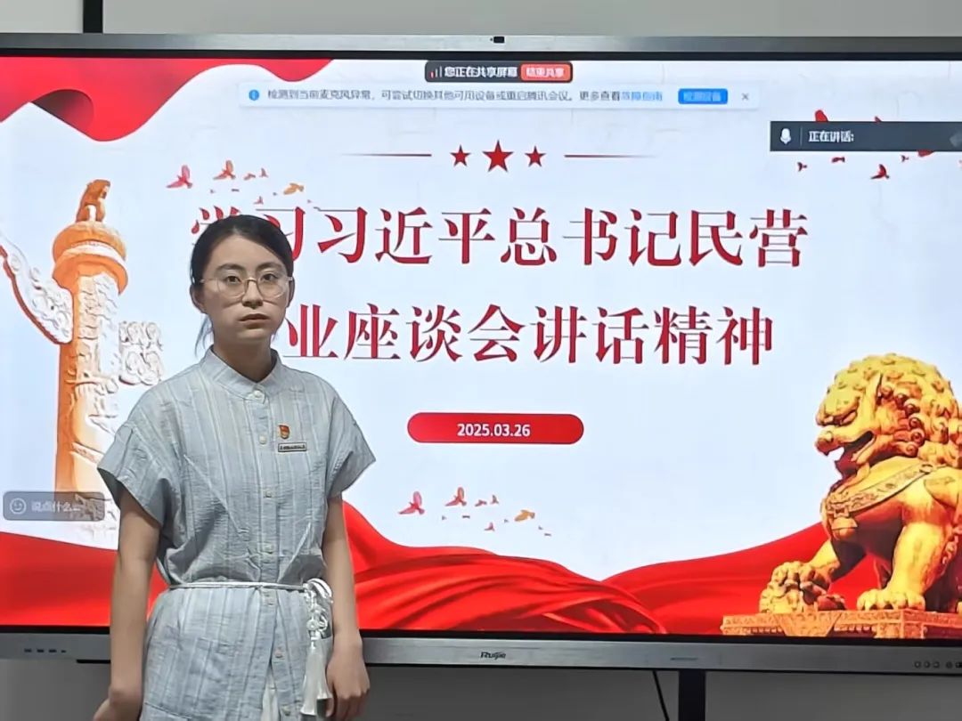 从企业自身出发,民营企业需构建亲清政商关系,强化执法监督,提升政务服务水平。紧接着,会议围绕民营企业家的责任与担当展开讨论。民营企业家不仅要加强自主创业、推动产业创新融合发展、提升企业核心竞争力,更要积极履行社会责任,在推动共同富裕中发挥重要作用,投身公益事业,为社会和谐发展贡献力量。而后,会议进入总结与展望环节。民营经济在我国经济发展中具有不可替代的地位,习近平总书记的讲话为民营经济的发展指明了方向。最后,宣讲人分享了个人心得感悟。她对民营经济的重要性有了更深刻的认识,明确了自身在推动民营经济发展中的责任。学生党员应主动学习经济知识,关注民营经济发展动态,积极参与社会实践,为民营经济的高质量发展建言献策,贡献自己的智慧与力量。