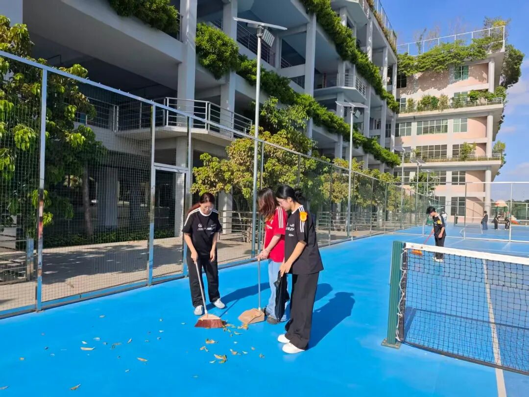 在校园“主人”周的网球场扫地活动中,我有了很实在的感悟。我们按场地划分区域,每人拿着扫帚,从球场边线开始,一点点清扫散落的落叶、沙尘。原本以为扫地很简单,可真正清扫才发现,落叶总卡在缝隙里;风一吹,刚扫好的垃圾又散了,来来回回好几次才清理干净。这让我真切体会到,维护运动场地的整洁,远比看起来更费力。活动后我发现,在之后的活动里,大家会主动帮动作慢的同学,互相提醒细节,团队里的默契悄悄变多了。 这次扫地也让我懂了,“主人”不是虚名,而是知道清扫的辛苦后,愿意主动爱护场地的责任心。
